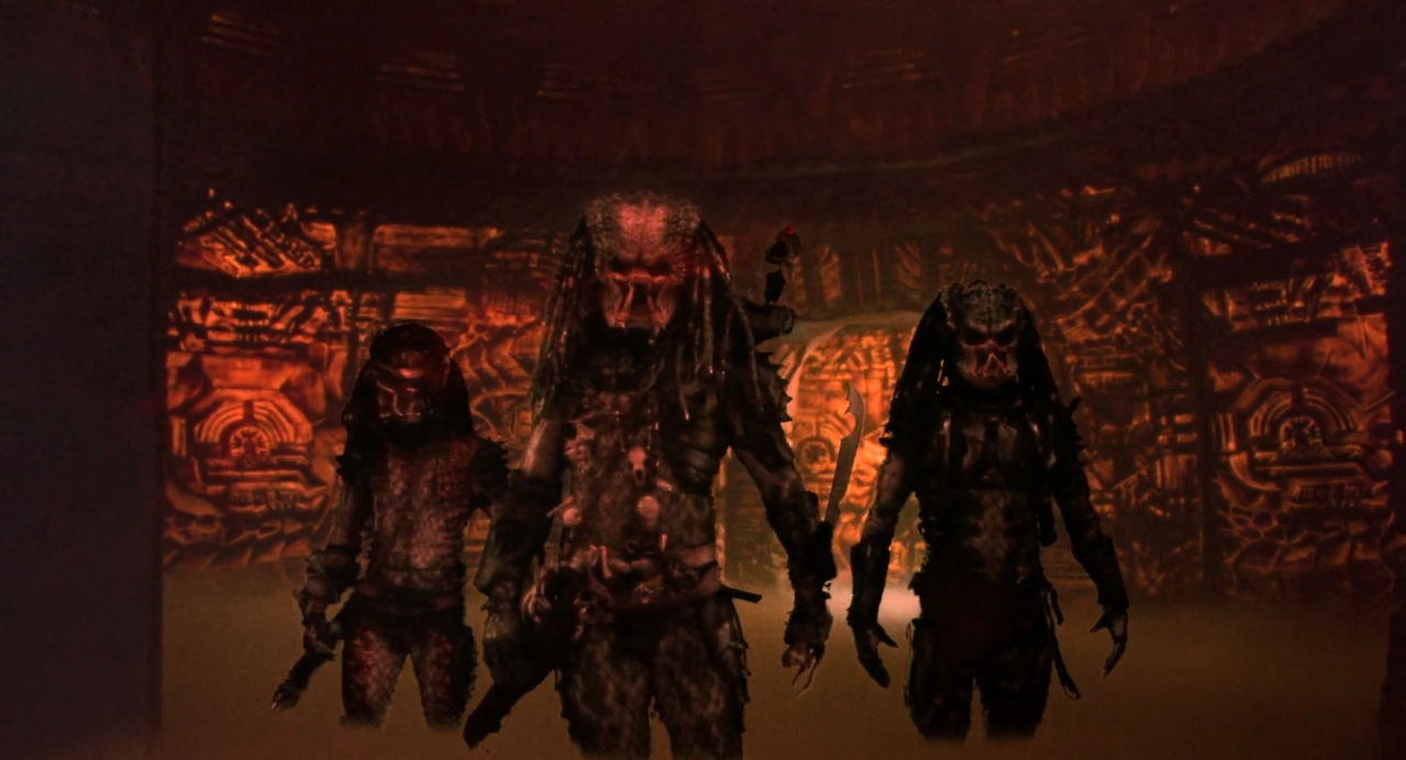 그 순간 많은 수의 프레데터들이 나타난다. 그들을 본 해리건은 죽을 각오를 하고 모든 것을 포기한다. 그들 중 한 명이 나와 "영웅이여!"라며 칭찬의 말을 남기고는 1715년에 제작된 총을 건네준다. 그러자 다른 프레데터들은 해리건에게 해를 가하지 않고 물러간다. 우주선은 지구를 떠나고, 해리건은 위기일발의 순간 대폭발을 피해 그곳을 벗어난다. 현장으로 달려온 키스의 부하 거버는 "거의 잡을 뻔했었는데"라며 아쉬움을 표시한다. 그러자 프레데터가 오래전부터 가끔씩 지구로 날아왔다는 사실을 알게 된 해리건은 "또 기회가 있을 거야"라며 중얼거린다.