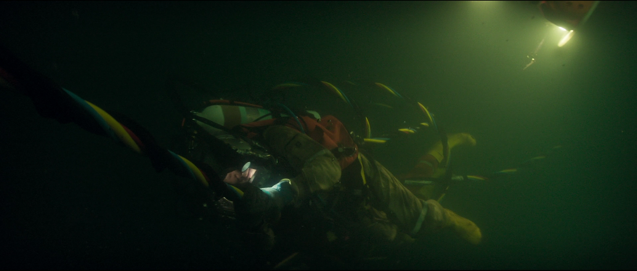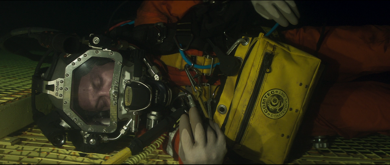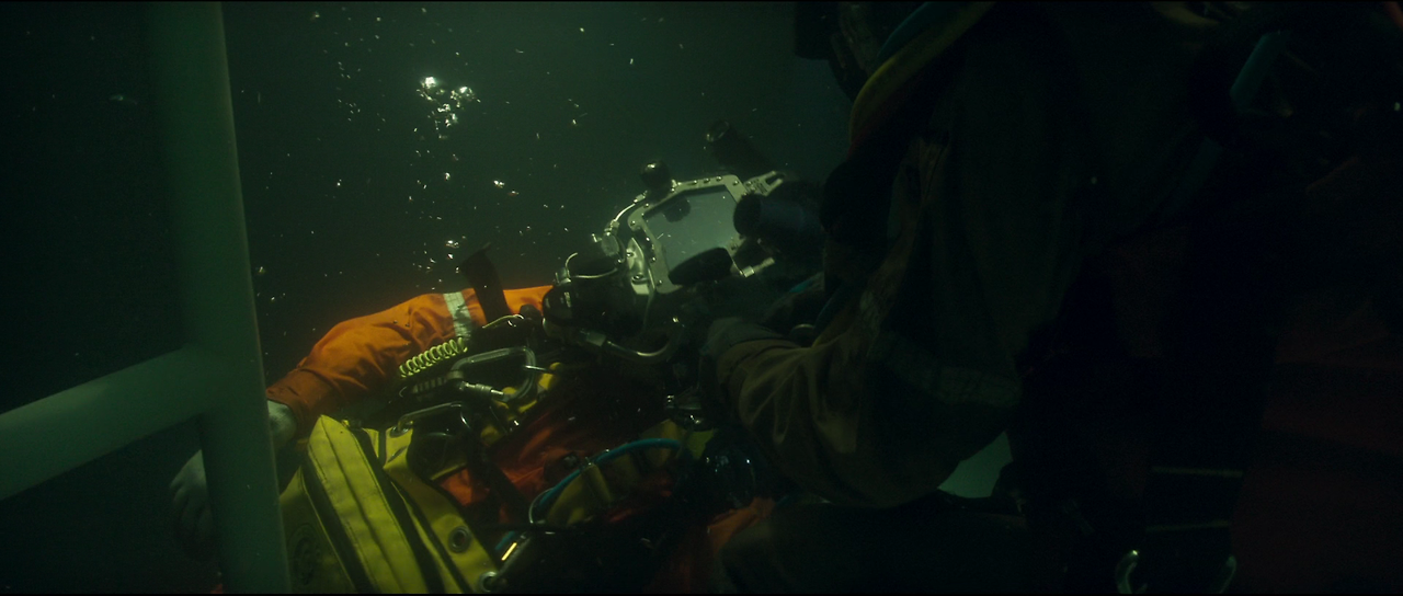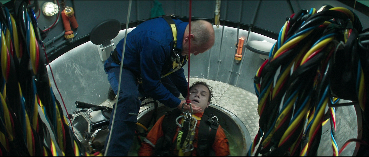 레몬스와 유아사는 잠수복을 입고 가압 벨을 나와 해저 가스관 관리 작업을 시작하고, 올콕은 챔버에 상주하며 이들의 작업을 모니터링하고 호스를 통해 통신, 전력 및 산소를 공급한다. 레몬스와 유아사가 가스관 연결점으로 이동하여 작업을 시작할 준비를 할 때, 바다 위에는 거친 폭풍이 몰아치며 파도가 높아진다. 거친 파도에 휩쓸리던 모선이 크게 흔들리면서 자동 위치조정 장치가 오작동을 일으켜 작업 현장에서 밀려가기 시작한다. 모선이 멀어짐에 따라 모선과 연결된 챔버가 끌려가고, 챔버와 연결된 레몬스와 유아사도 함께 끌려간다. 이대로 끌려갔다가는 깊이를 알 수 없는 심연으로 떨어질 가능성이 크다. 두 사람은 끌려가지 않기 위해 가스관 연결 장치 꼭대기로 허둥지둥 기어 올라간다.