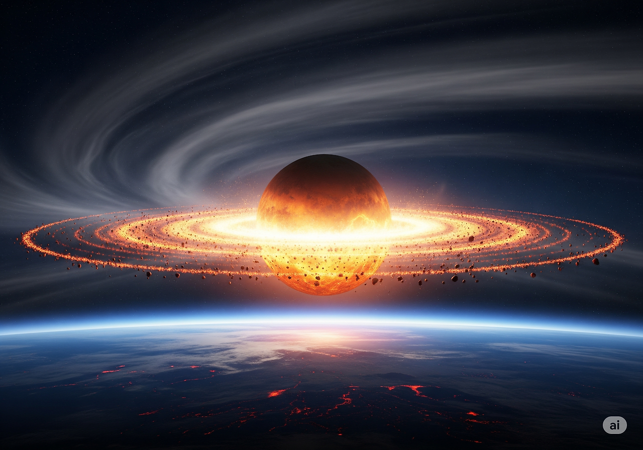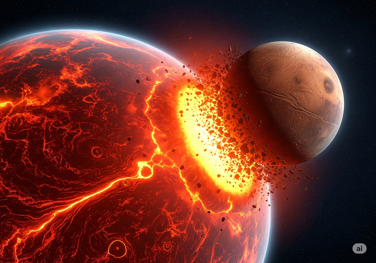 하데스 이언 중반(약 45억 년 전)에는 테이아 (Theia)라는 화성 크기의 천체가 지구와 충돌하는 대사건이 발생했다. 이 충돌로 튕겨 나간 파편들이 뭉쳐져 달이 형성되었다. 달은 현재보다 훨씬 가까이 있었으며, 지구의 자전 속도는 매우 빨라 하루의 길이가 6시간에 불과했다.