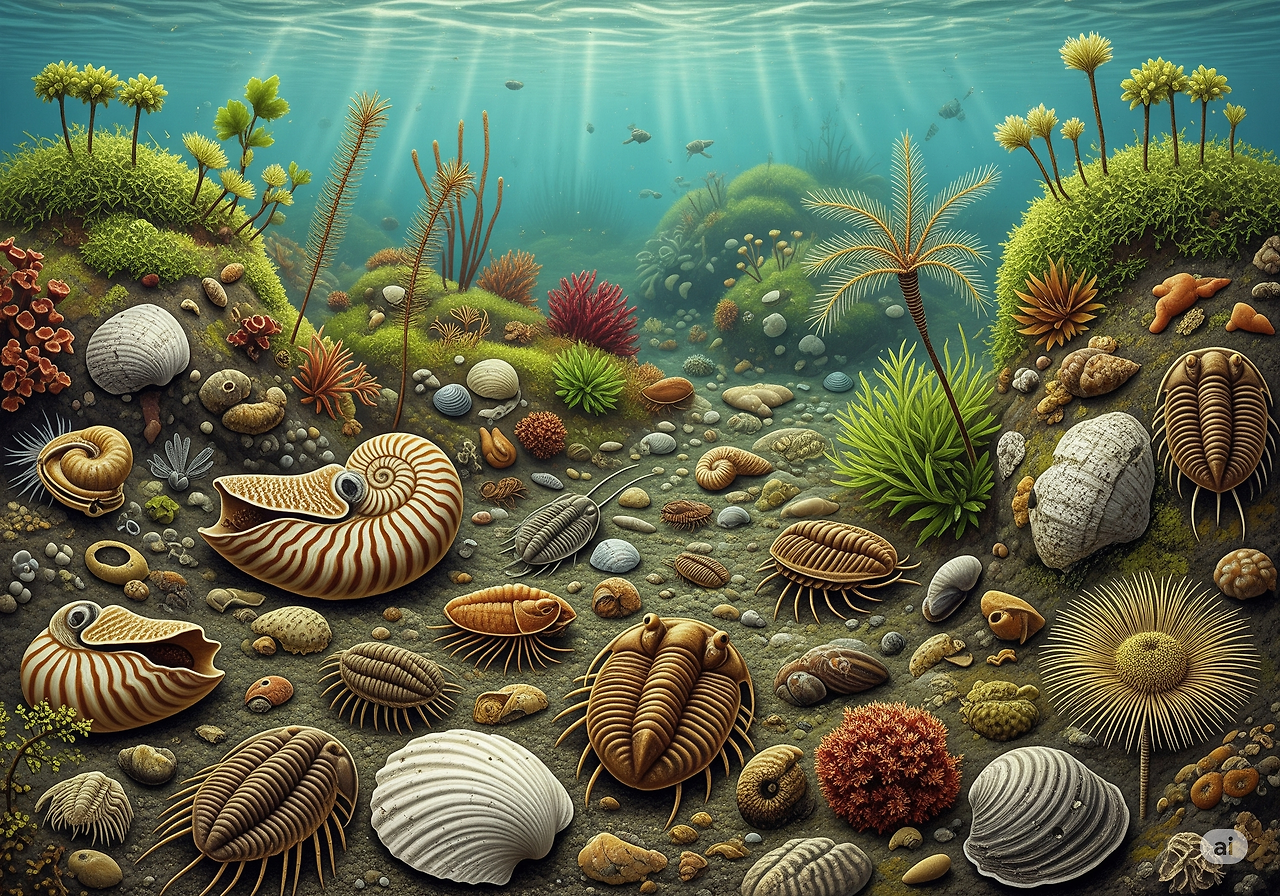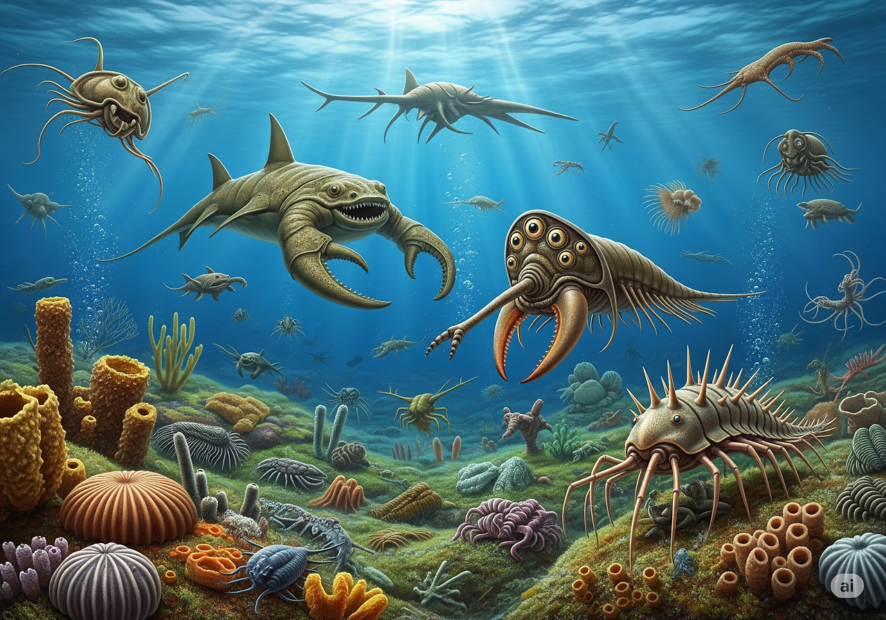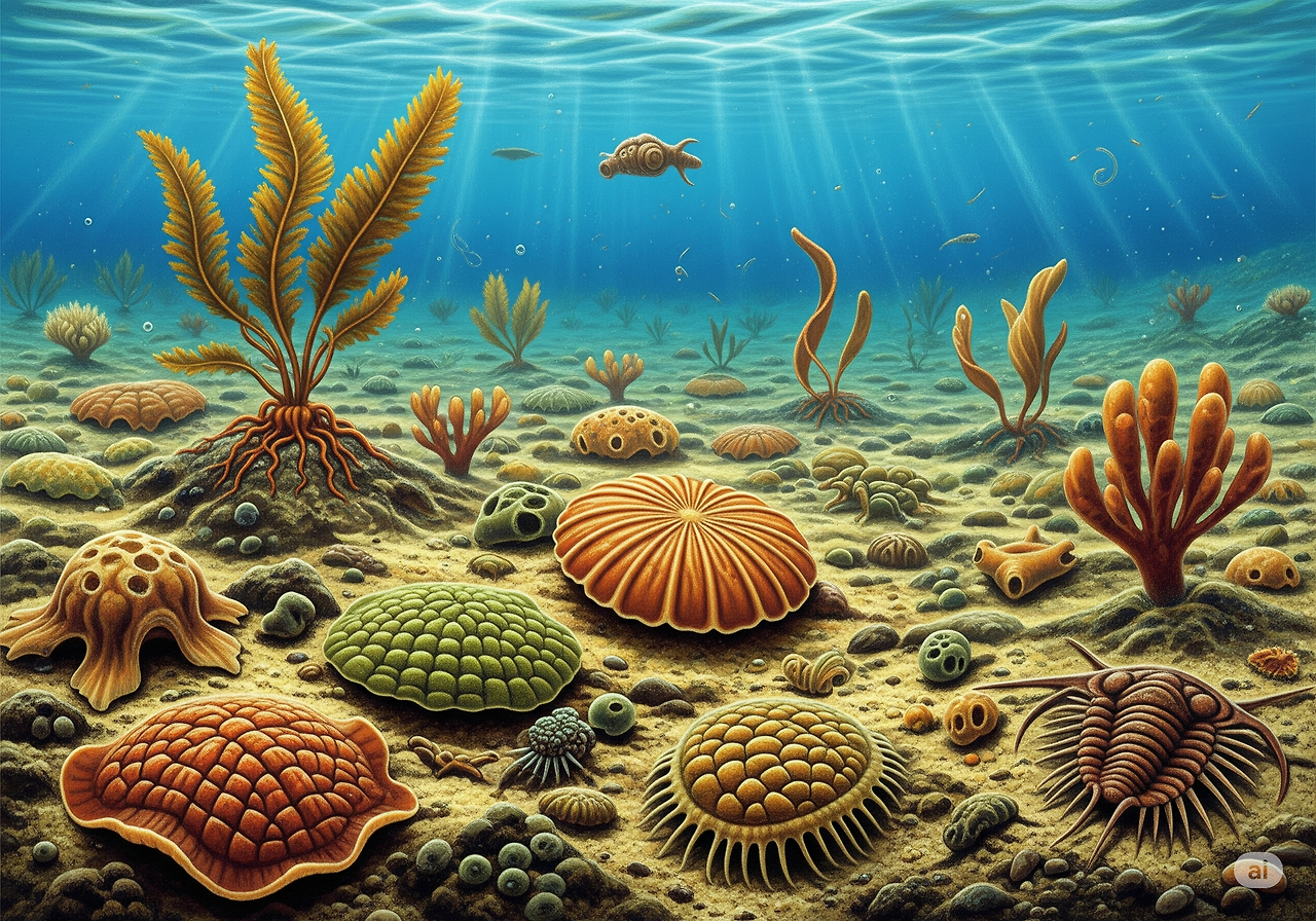 ※ 에디아카라 동물군 (Ediacaran biota): 지구상의 최초의 다세포 동물군으로서, 대부분 몸이 부드러워 뼈나 껍데기가 없었기 때문에 화석으로 남은 경우가 매우 드물다. 에디아카라 동물군 화석은 해파리, 깃털 모양의 해양 생물 또는 납작한 판 모양 등, 오늘날의 생물과는 매우 다른 독특한 형태를 가진다. 이들은 입이나 소화 기관 없이 몸의 표면을 통해 주변의 물에서 영양분을 직접 흡수하며 살았을 것으로 추정된다.