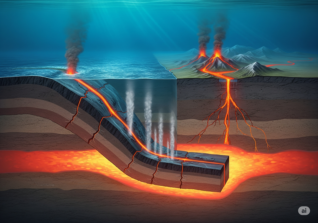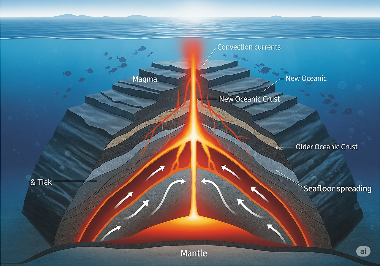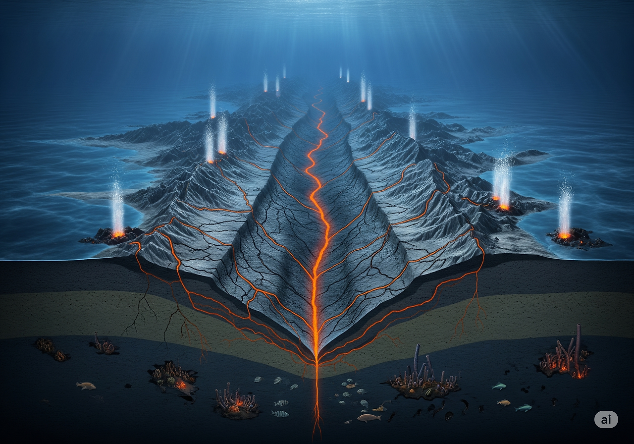 ※ 해령 (海嶺, mid-ocean ridge): 해저에 길게 이어진 거대한 산맥을 의미하며, 이는 지구 내부의 맨틀 대류가 상승하는 곳으로, 이곳에서 새로운 해양 지각이 생성되어 양쪽으로 확장된다. 해령의 정상부에는 ‘열곡’(Rift Valley)이라는 V자 모양의 깊은 골짜기가 존재하는데, 이곳은 뜨거운 마그마가 분출되는 통로 역할을 한다.