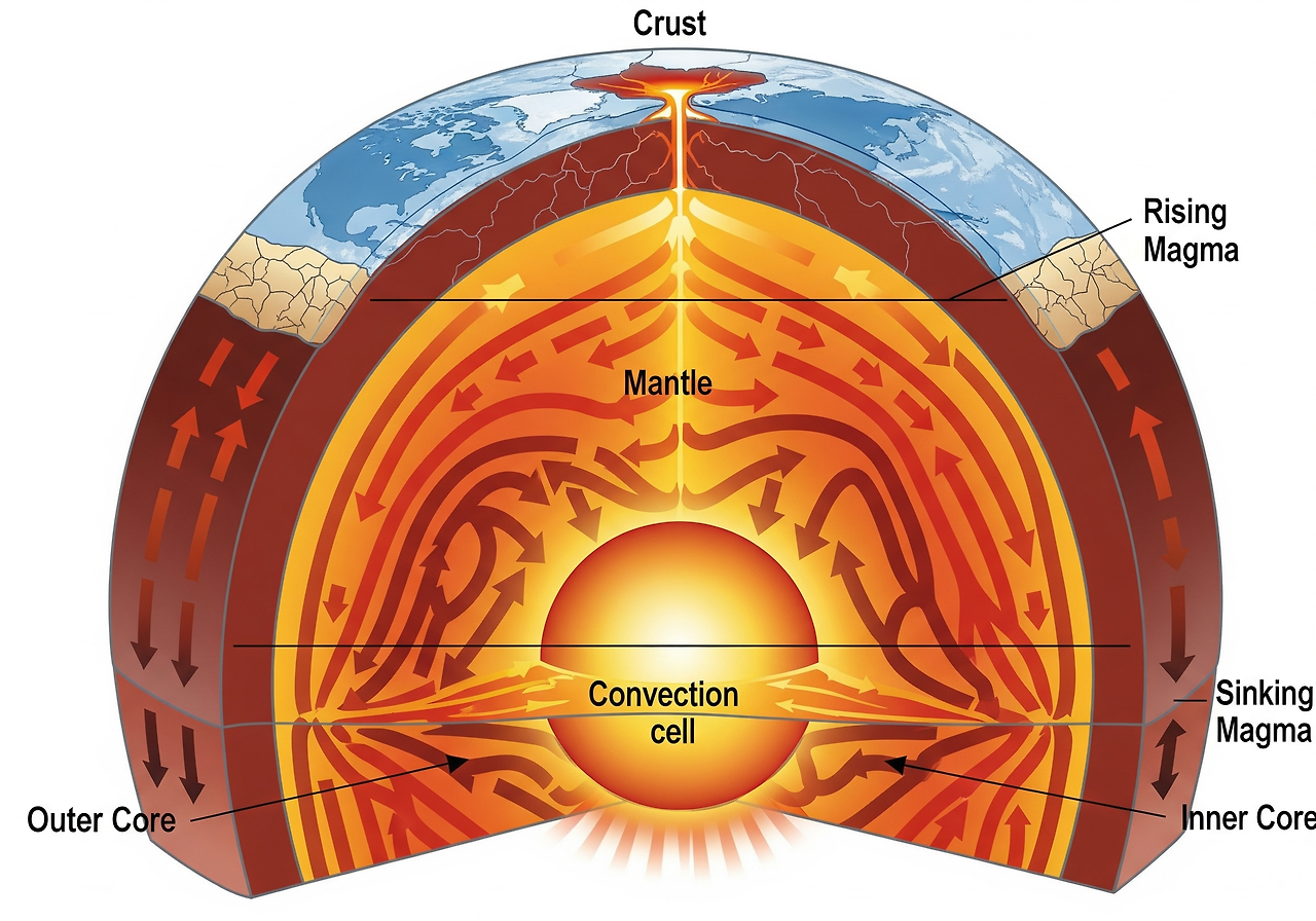맨틀 하부 (핵과 가까운 쪽)는 뜨겁고, 맨틀 상부 (지각과 가까운 쪽)는 상대적으로 차갑다. 뜨거운 물질은 밀도가 낮아져 상승하고, 차가운 물질은 밀도가 높아져 하강한다. 이러한 온도 차이로 인한 밀도 변화가 맨틀 물질의 지속적인 순환 운동, 즉 맨틀 대류를 일으킨다. 이 대류는 지각판을 움직이는 원동력이 되어 지진, 화산 활동, 산맥 형성, 대륙 이동 등 다양한 지질학적 현상을 일으킨다.