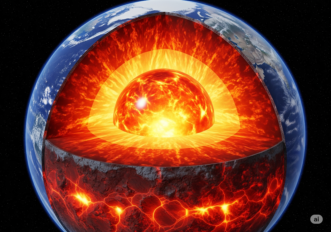 • 내핵 (Inner Core): 외핵 아래 약 5,100km 깊이부터 지구 중심인 약 6,400km 깊이까지 이어진다. 반지름은 약 1,200km이다. 외핵과 마찬가지로 철과 니켈이 주성분이지만, 엄청난 압력으로 인해 고체 상태를 유지하고 있다. 온도는 태양 표면 온도와 비슷한 약 5,000~6,000°C에 달한다. 내핵은 외핵의 움직임과 독립적으로 회전하는 것으로 추정된다.