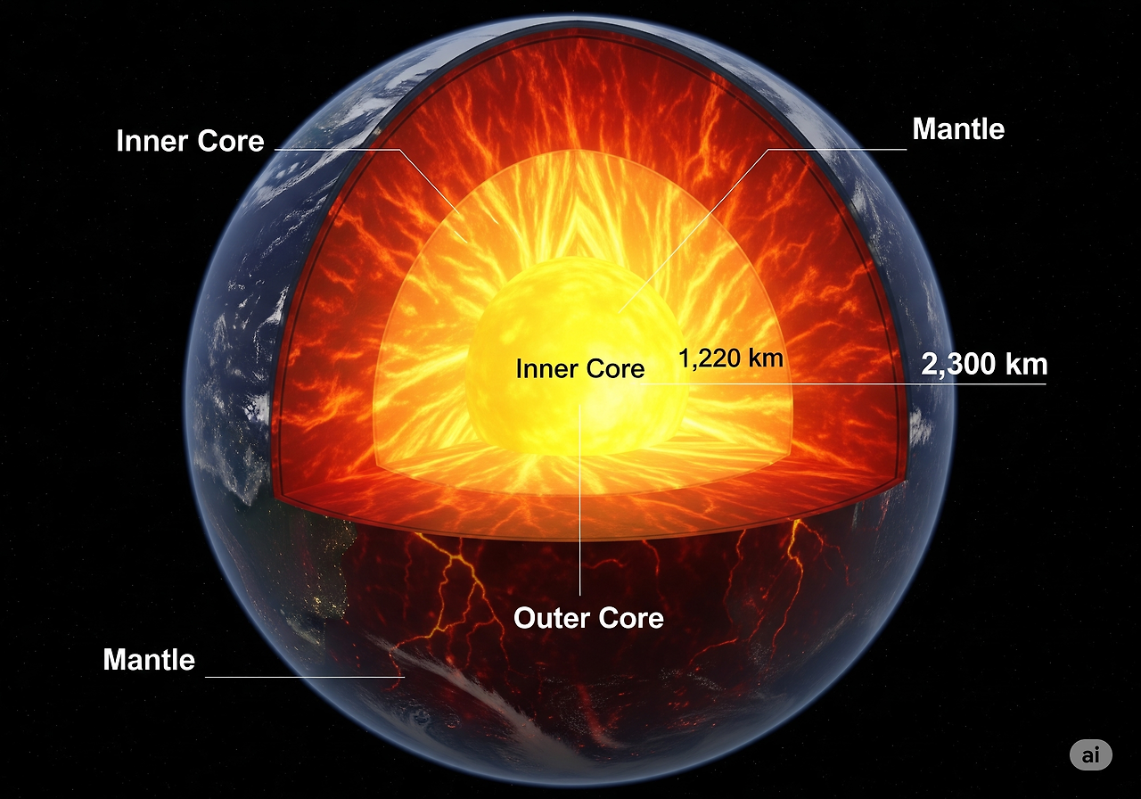 • 하부 맨틀 (Lower Mantle): 약 660km에서 2,900km 깊이까지 이어진다. 매우 높은 압력으로 인해 단단하고 고체 상태를 유지하고 있다.