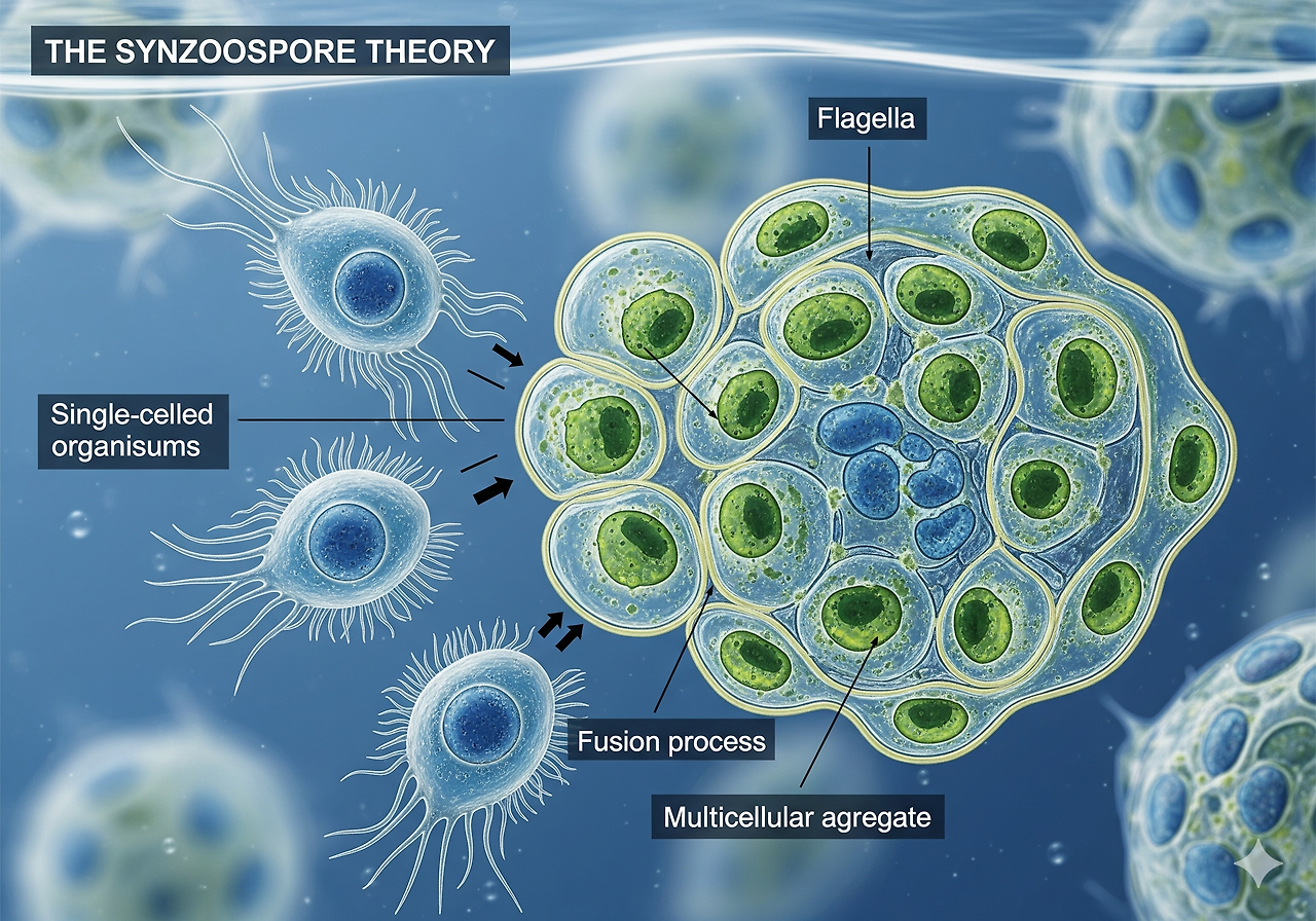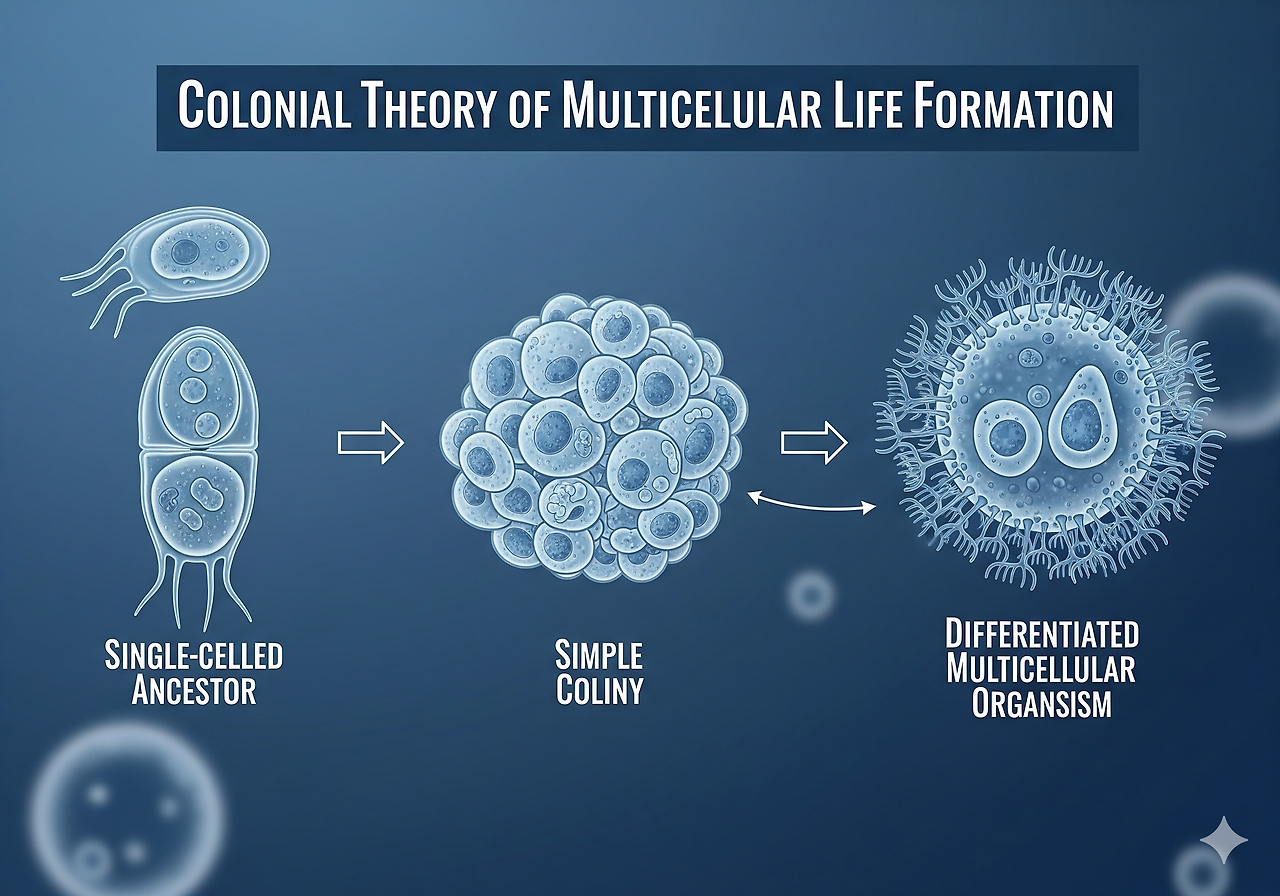 이 가설은 단세포 생물들이 서로 모여 집단을 이루고, 시간이 지나면서 각 세포가 특정 기능을 전담하는 방향으로 분화되었다는 것이다. 즉, 처음에는 모든 세포가 동일한 기능을 수행하는 단순한 집단이었지만, 점차 분업이 이루어져 하나의 복잡한 개체로 발전했다는 이론이다. 이 가설을 뒷받침하는 예로, 오늘날에도 볼 수 있는 볼복스(Volvox)와 같은 군체성 조류가 있다. 볼복스는 수백에서 수천 개의 단세포들이 모여 구형의 군체를 이루며, 일부 세포는 생식 기능을, 다른 세포는 운동 기능을 담당한다.