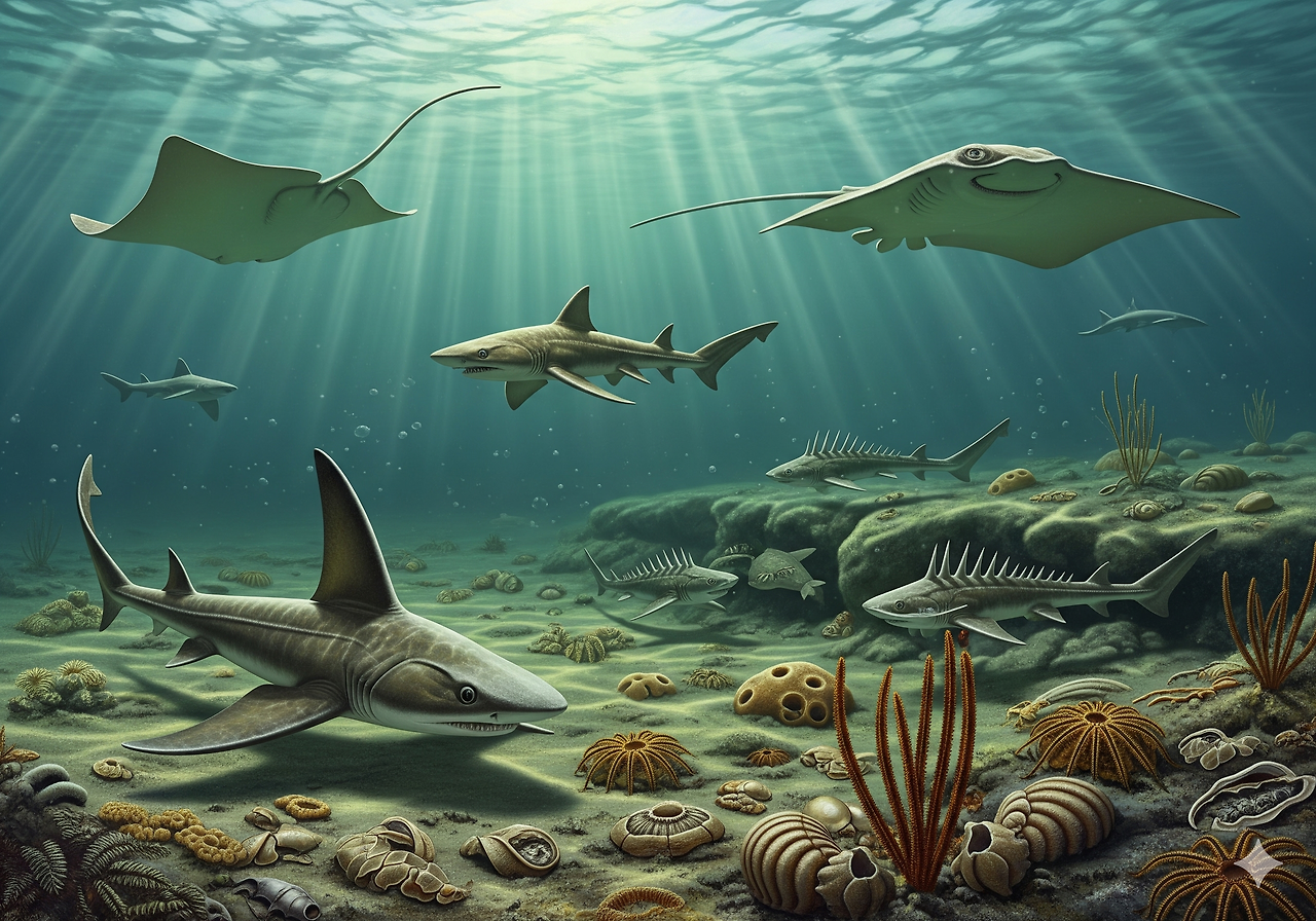 • 연골어류 (Cartilaginous Fishes): 상어와 가오리 같은 어류의 조상으로, 이 시기에 처음 출현하였다. 일부 종은 몸길이가 2미터에 이르기도 하였다.