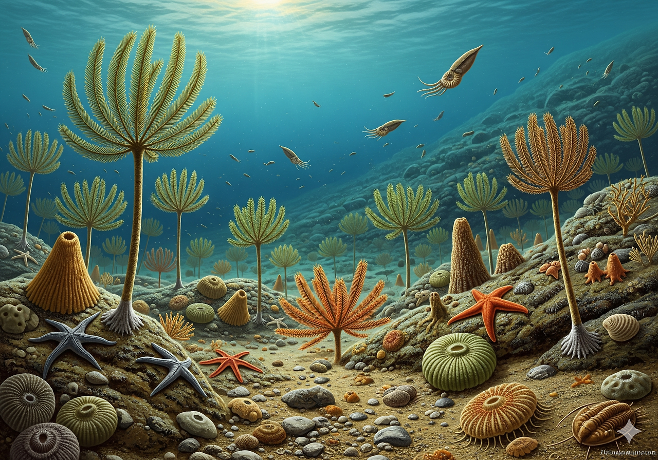 • 해백합 (Crinoids)과 극피동물: 해백합과 불가사리의 조상인 극피동물이 번성하였다.