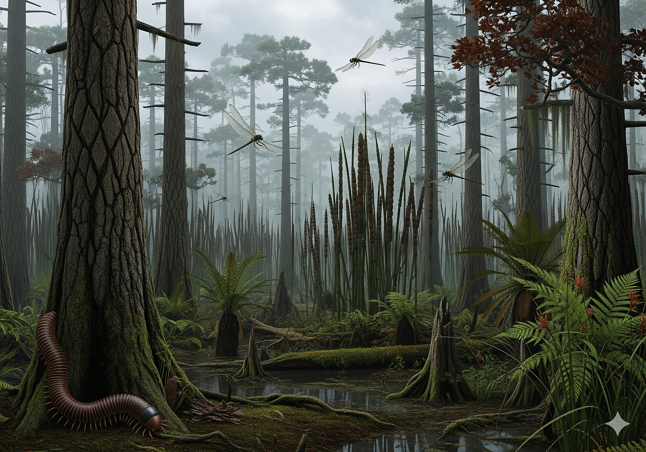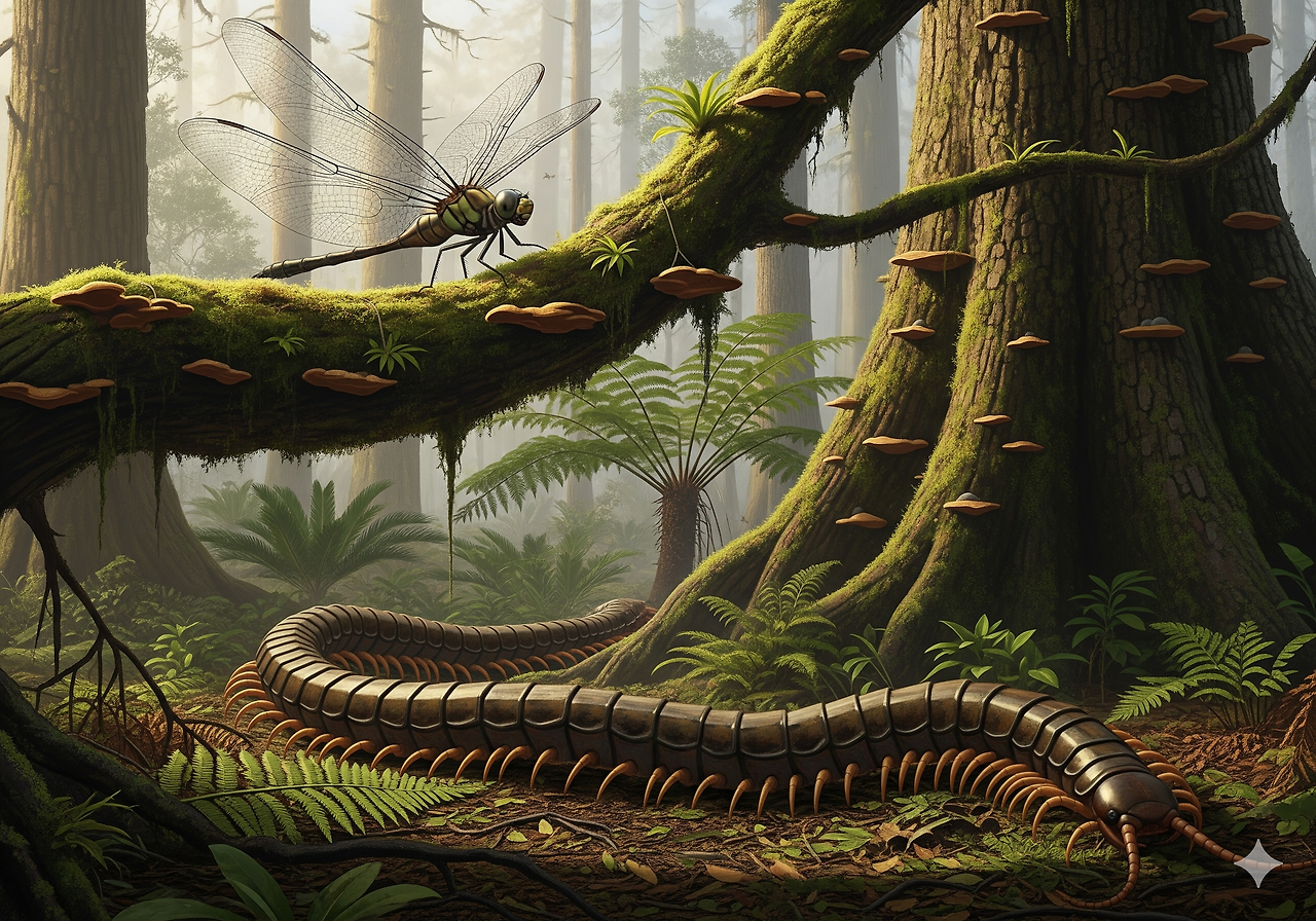 석탄기의 높은 산소 농도 덕분에 절지동물은 거대한 크기로 진화하였다. 메가네우라(Meganeura): 날개폭이 75cm에 달하는 거대한 잠자리로, 공중의 주요 포식자였다. 아르트로플레우라(Arthropleura): 몸길이가 2.6m에 이르는 거대 지네로, 초식 동물이었다.