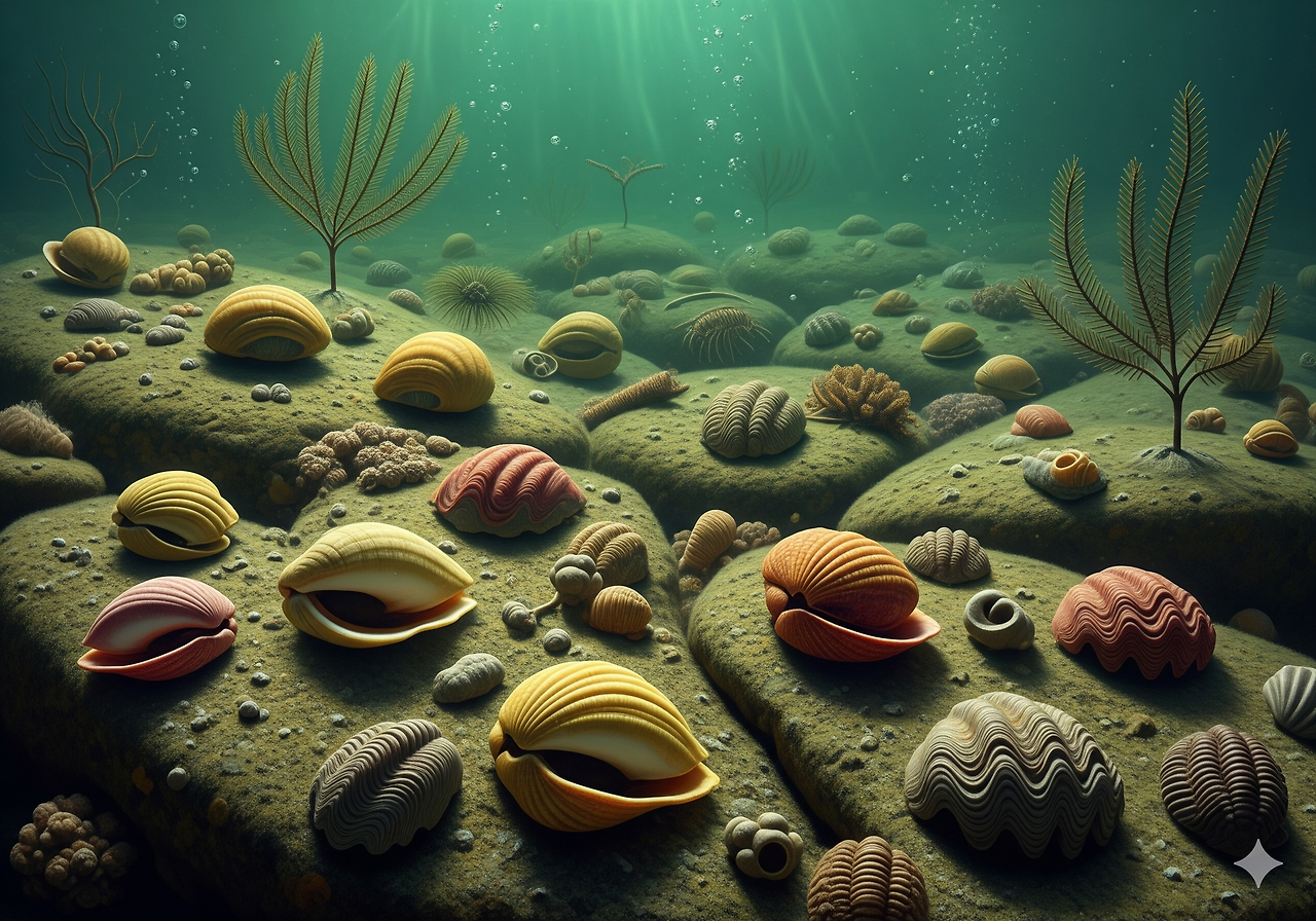 • 완족류(Brachiopods): 해안가 얕은 바다에 서식하며 풍부하게 존재하였다.
