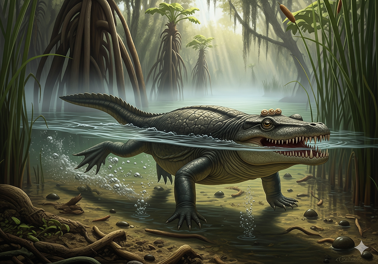 • 카스토로사우루스 (Castorosaurus): 몸길이가 2m에 달하는 거대한 양서류로, 악어와 유사한 형태를 하고 있었다. 주로 습지나 강가에서 물고기를 사냥하며 살았다.