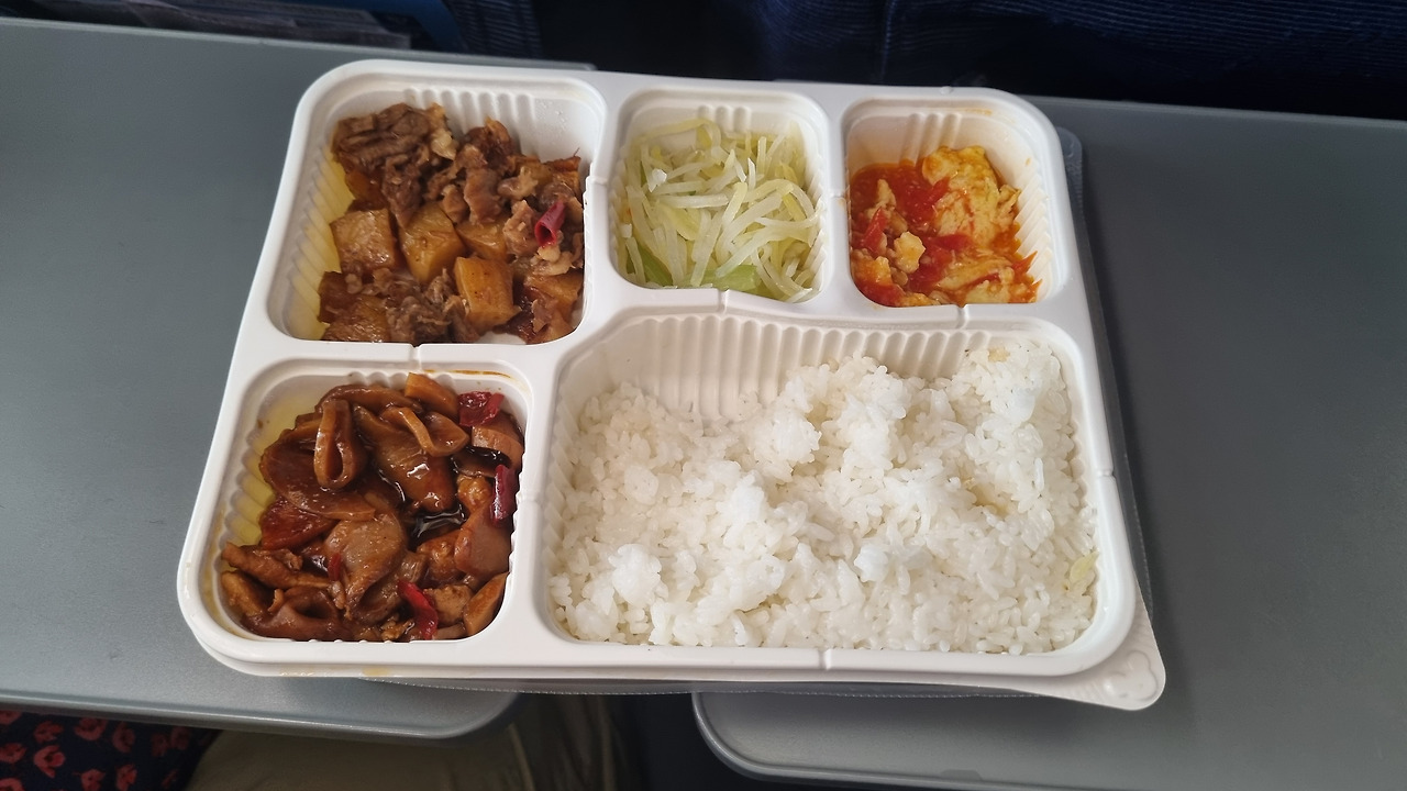 자리에 앉아 한숨을 돌리나 목도 마르고 배도 고파온다. 주위 사람들이 도시락을 먹고 있다. 바로 뒷 량에 식당차가 있어 사람들이 그곳에서 도시락을 사 먹는 것 같다. 일단 도시락을 사라 갔다. 말은 전혀 통하지 않는다. 식당차 직원이 메뉴판을 보여주지만, 무엇이 무엇인지 알 수가 없다. 그 사이에 내 뒤에도 몇 사람이 줄을 서 빨리 주문을 끝내라는 눈치이다. 앞에 도시락이 보이길래 그냥 그것을 달라고 했다. 돈을 계산했는데도 직원은 도시락은 주지 않고 자꾸 자리로 돌아가라고 손짓한다. 일단 자리에 돌아가 앉아 있으니, 얼마 후 직원이 따끈히 데운 도시락을 배달해 준다. 그렇다. 여긴 식당차도 배달제이다. 나처럼 식당칸을 찾아갈 필요도 없다. 직원이 좌석 옆으로 지나갈 때 그때 주문하면 된다.