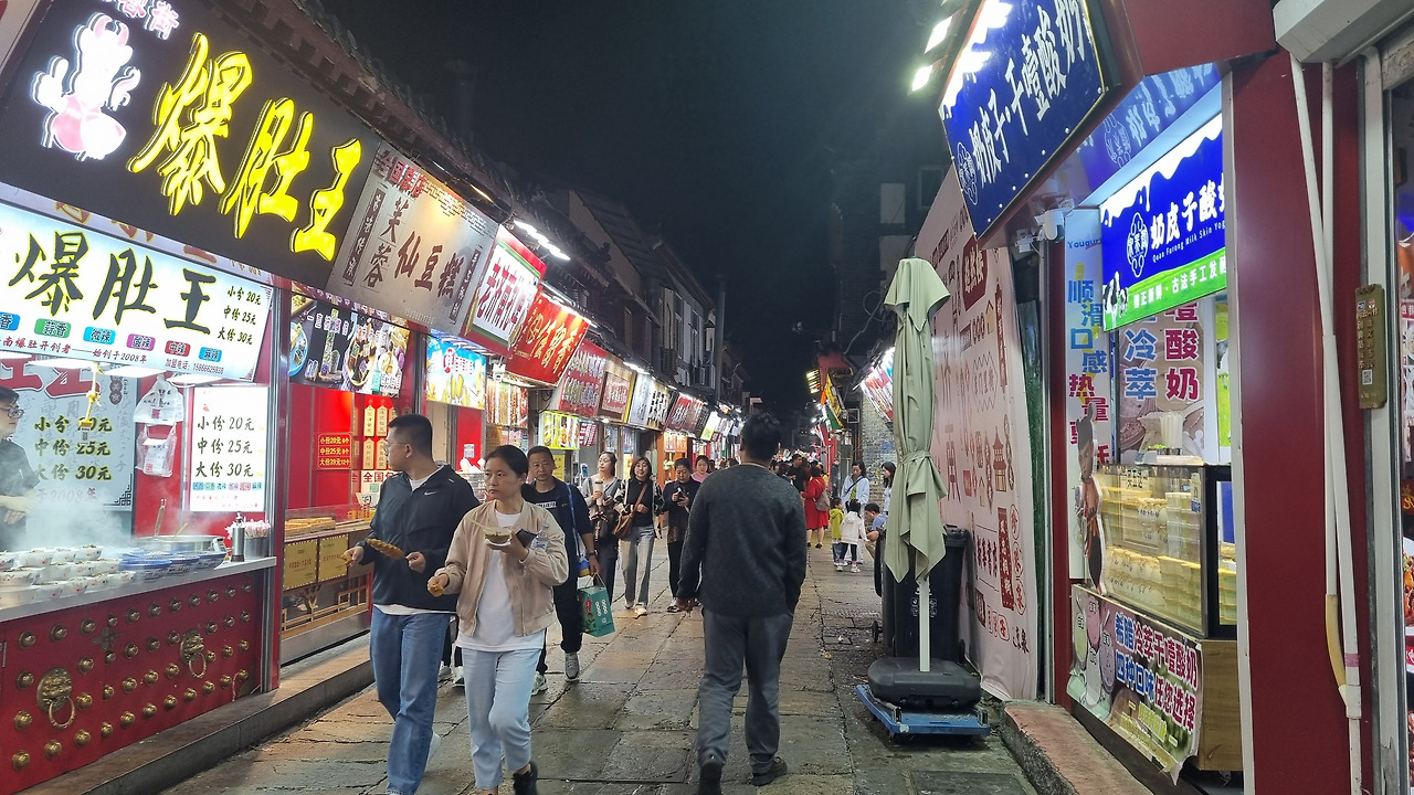 부용가는 폭 3~4미터 정도의 좁은 골목이었다. 화려한 조명 아래 전통적인 건물이 늘어서 있으며, 거리 전체가 활기 넘치는 시장 분위기를 풍겼다. 다양한 기념품 가게와 길거리 음식을 파는 좁은 가게들이 길 양쪽에 빽빽이 늘어서 있었다. 부용가 골목은 상당히 길어 거의 500미터 정도 되는 듯하였다. 여러 가지 싸고 맛있는 음식을 팔고 있어 맛보고 싶었으나, 저녁을 너무 많이 먹어 더 이상 먹을 수가 없었다. 그냥 눈요기만 할 수밖에 없었다.