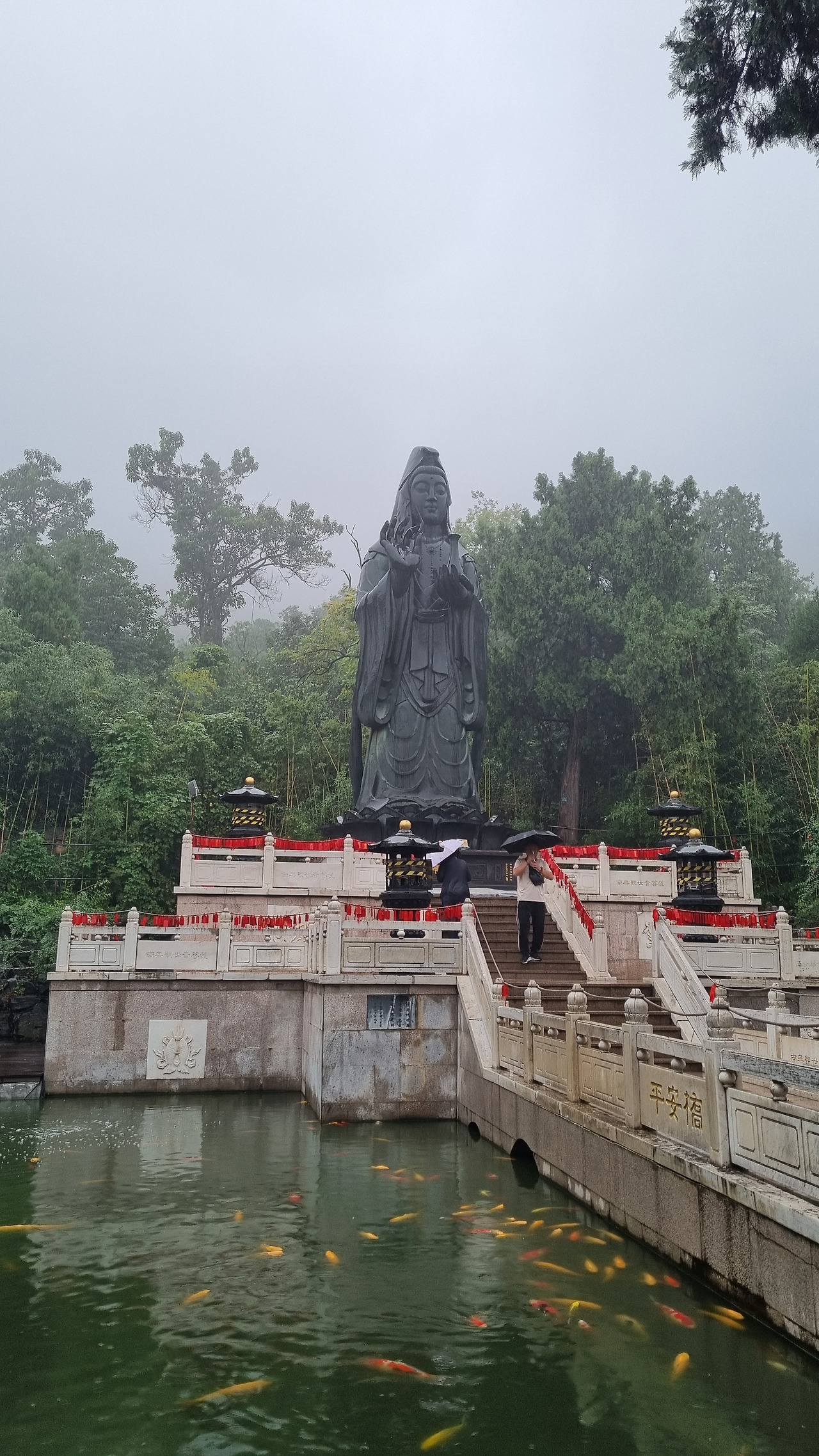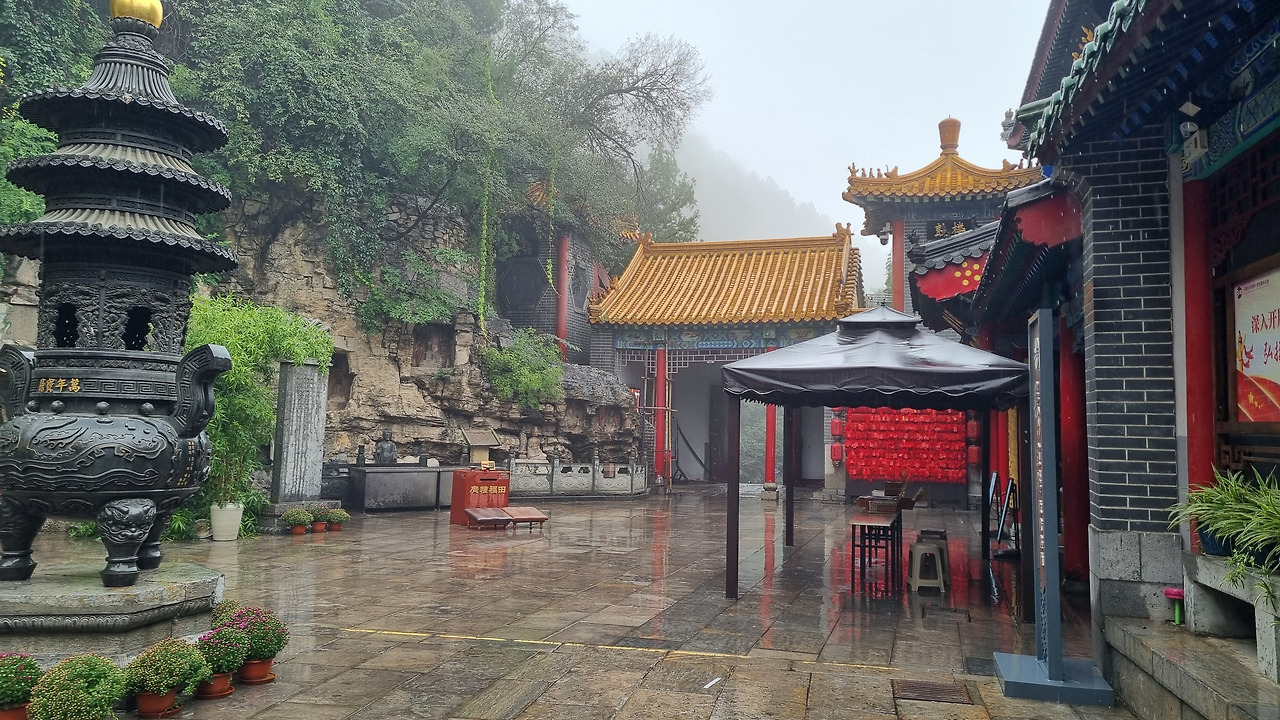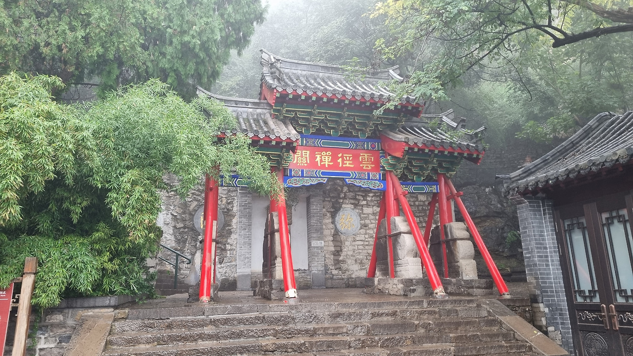 계단길은 아주 넓었다. 길 양쪽에는 고승들의 석상이 줄지어 놓여 있었다. 그런데 그 석상 앞으로 기념품 가게와 패스트푸드 점포가 늘어서 있어 석상을 가리고 있었다. 이들 가게는 비 때문에 탐방객이 없어서인지 모두 문을 닫고 있었다. 가게들이 석상을 가리고 있어 아쉬웠으나 뒤로 돌아가 석상들을 살펴보았다. 대부분의 석상의 승려들 얼굴이 한족이 아니었다. 서역인처럼 보이기도 하고 인도인처럼 보이는 사람들이 많았다.