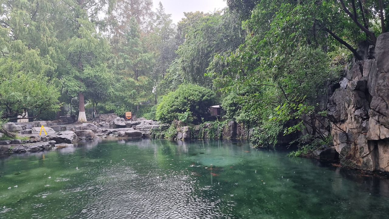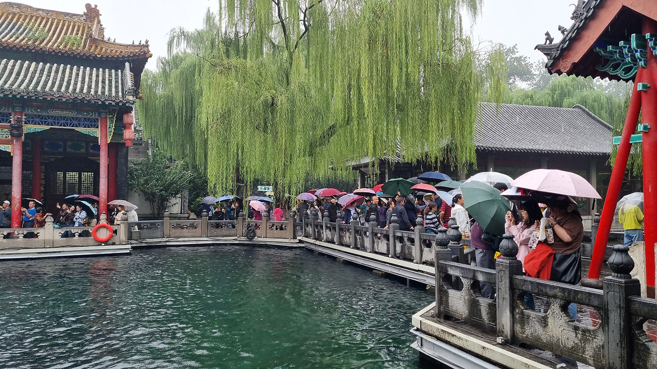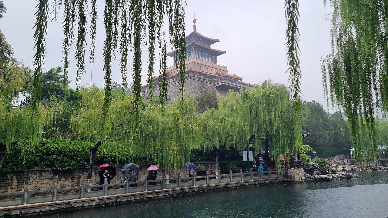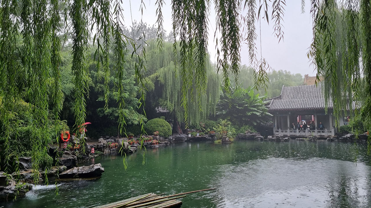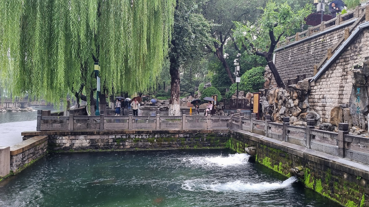 천하제일천 역시 입장료가 40위안이었으나, 경로 우대로 무료로 입장할 수 있었다. 입구를 통과하니 바로 표돌천이 나왔다. 비가 오는 날인데도 불구하고 표돌천 주위에는 사람들이 바글바글 몰려 제대로 구경하기 힘들 정도였다. 표돌천 큰 연못 아래에서 물이 솟아나는데, 물이 너무나 맑았다. 표돌천 주위는 수양버들이 늘어져 있었고, 연못을 감싸고 아름다운 건물들이 들어서 있었다. 연못과 건물, 그리고 수양버들이 어울려 환상적인 모습을 보여주었다. 정말 아름다운 샘이었다.