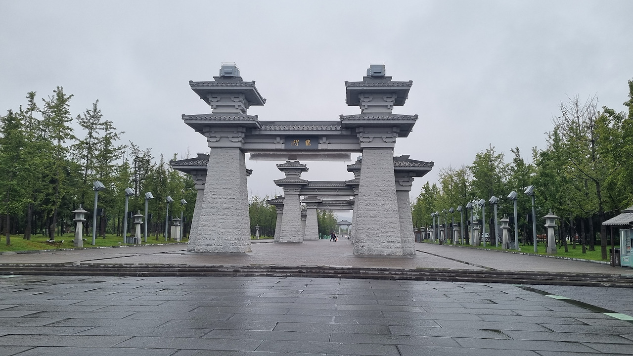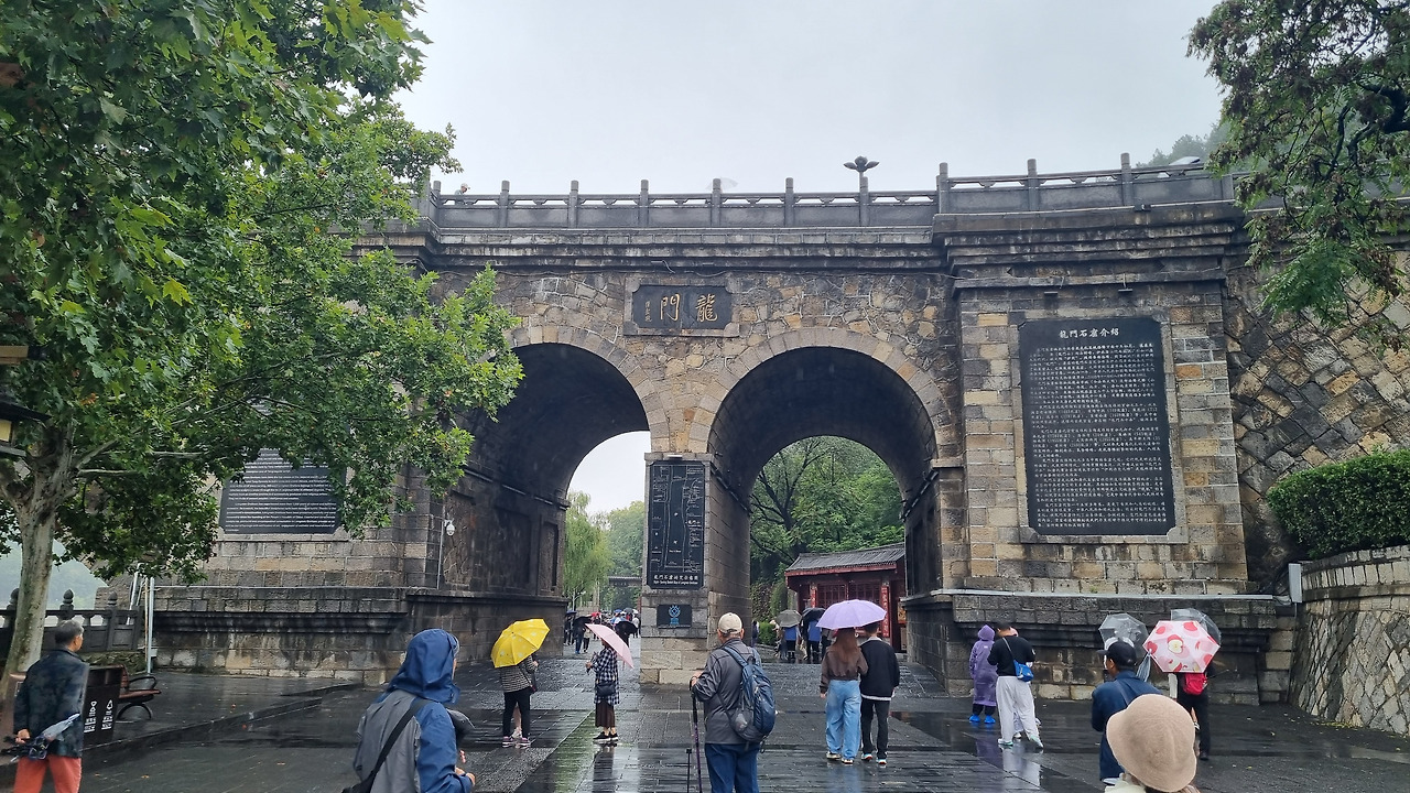 용문석굴은 중국의 다른 문화재와 마찬가지로 인터넷을 통해 예약을 하여야 한다. 어제저녁 트립닷컴을 통해 예약했는데, 입장료는 90위안이다. 어제 갔던 백마사와 마찬가지로 이곳도 경로무료는 중국인들에게만 적용된다. 택시를 타고 용문석굴 입구에 내렸다. 하늘은 곧 비가 내릴 듯 잔뜩 찌푸리고 있다. 입구에는 흰 화강암으로 만든 몇 개의 거대한 문이 있다. 이곳에서 용문석굴 지역까지는 1킬로 정도 된다. 걷기 싫은 사람들을 위하여 유료 전동카트가 마련되어 있다.