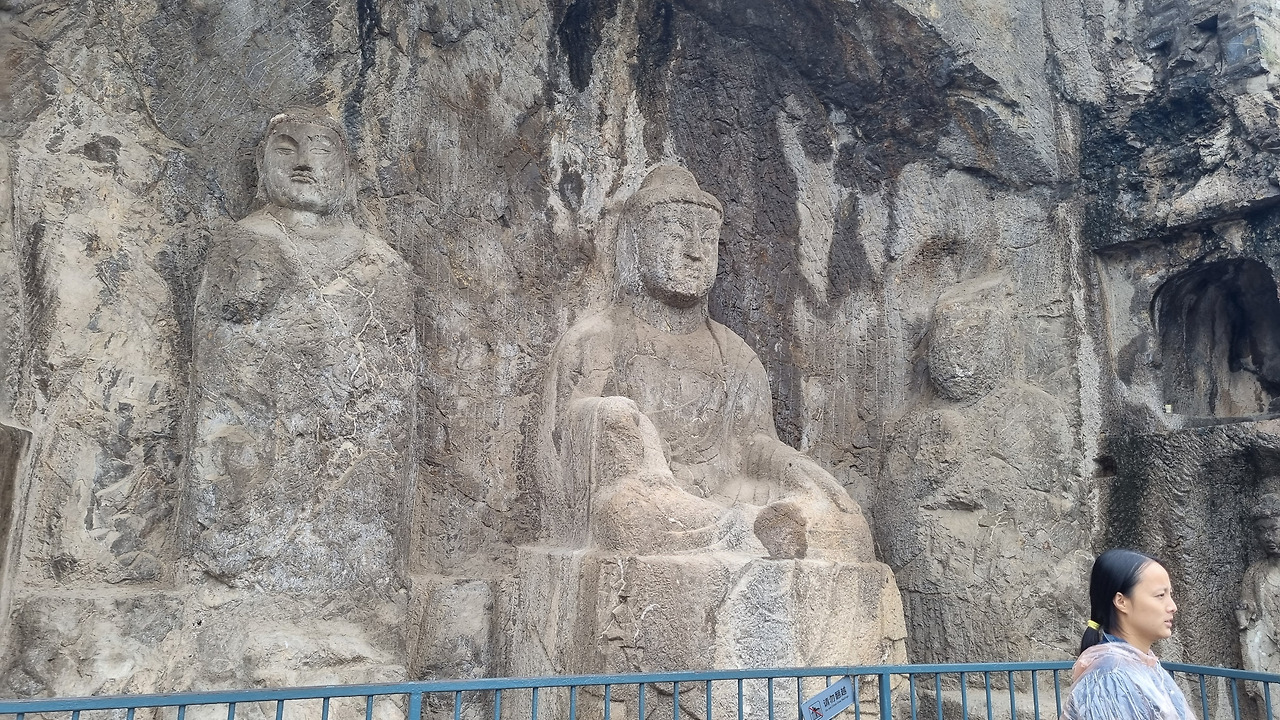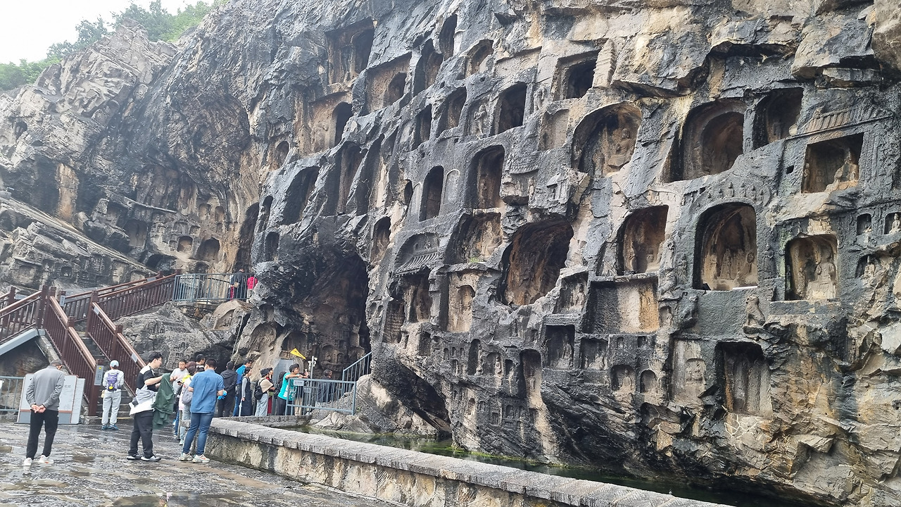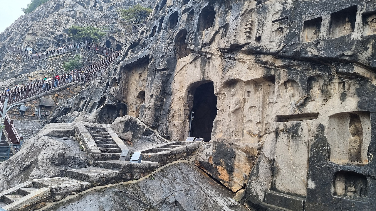 용문석굴 구역으로 들어왔다. 앞에는 이하강이 흐르고 오른쪽 석벽에는 수많은 석굴들이 뚫어져 있다. 석굴을 탐방하기 위한 계단길도 잘 정비되어 있다. 석굴이라고는 하지만 그다지 깊지는 않다. 그저 불상을 모셔놓을 정도의 얕은 굴이다. 크고 작은 굴 속에는 그 굴의 크기에 맞는 크고 작은 불상들이 모셔져 있다.