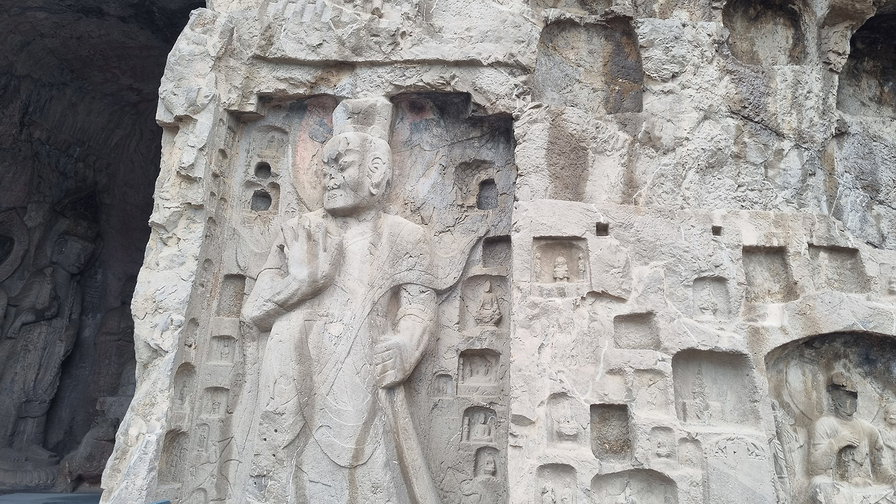 갑자기 거대한 굴이 나타난다. 굴이라기보다는 절벽 한쪽을 잘라낸 듯한 곳이다. 이곳은 봉선사동 (奉先寺洞)으로 용문석굴의 하이라이트이자 당나라 석굴 조각 예술의 최고 걸작이다. 당 고종 때 측천무후(則天武后)의 후원으로 조성되었다고 하는데, 중앙에 높이 17미터가 넘는 거대한 비로사나불(毘盧舍那佛)이 좌정하고 있다. 이 비로자나불은 측천무후의 용모를 모델로 하였다고 한다. 그런데 얼굴은 상당히 온화하면서도 위엄 있는 모습이다. 측천무후는 보통 폭군이자 악녀로 평가되는 경우가 많은데 그녀의 이미지가 부처와 어떻게 어울리는지 모르겠다.