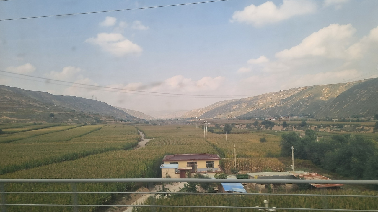 란저우를 두 시간 정도 앞두고는 풍경이 완전히 달라졌다. 터널의 연속이다. 긴 터널을 지난 후 잠깐 동안 높은 산 사이로 달리다가 다시 터널로 들어간다. 기차의 속도도 보통 시속 300킬로미터가 넘었으나, 250킬로미터 정도로 낮아진다. 한 가지 특이한 점은 사막과 황무지가 드러난 벌판이 많지만 농경지만은 아주 푸르다는 점이다. 수리시설을 제대로 갖춘 모양이다. 아파트는 오래된 아파트건 신축아파트건 대부분 누런색이다. 어차피 페인트칠을 하는 건데, 왜 저렇게 우중충한 색을 선택하는지 모르겠다.