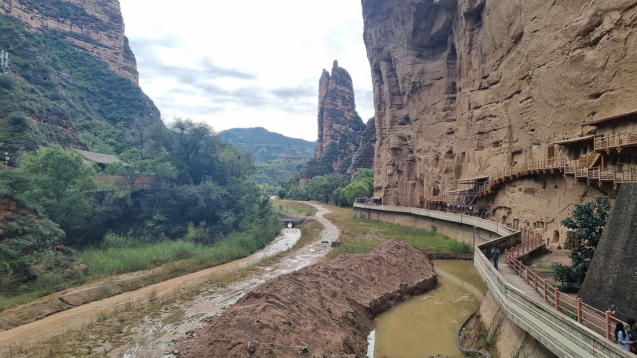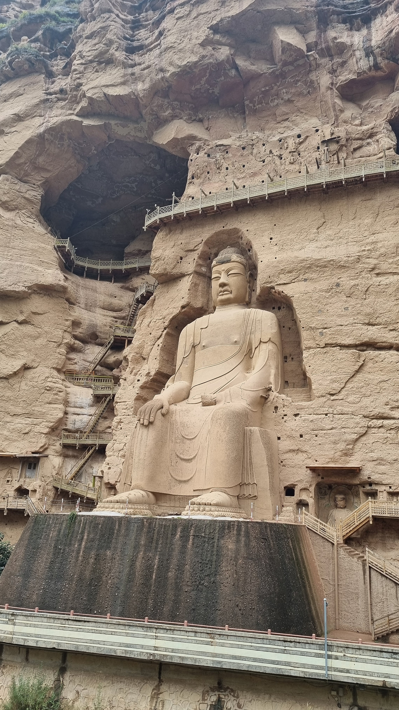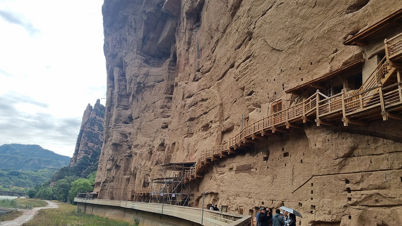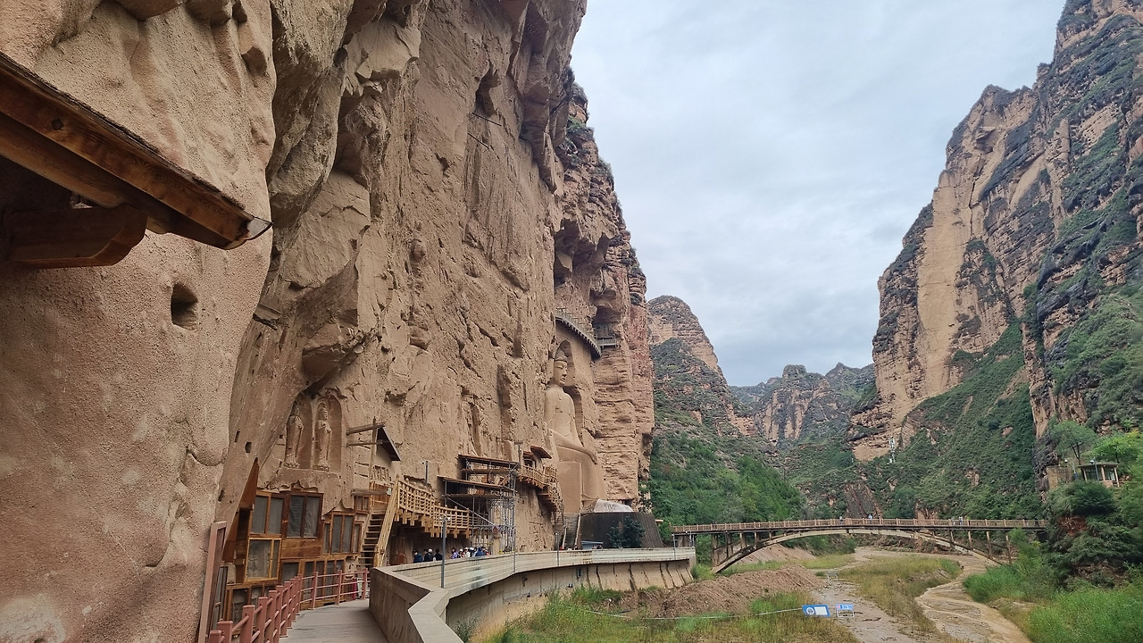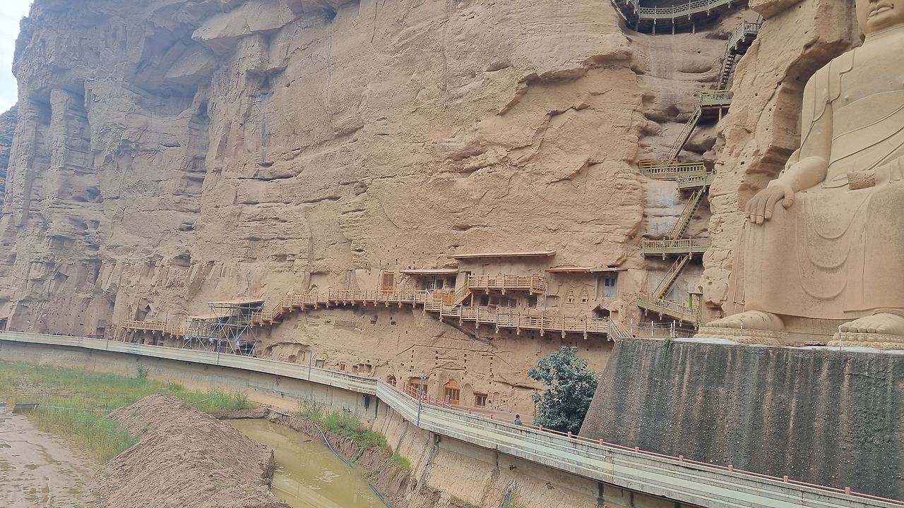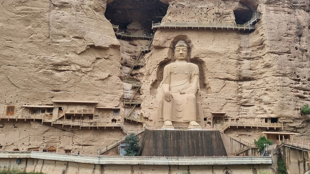 병령사 석굴도 당연히 입장료를 받는다. 80위안, 이 정도는 이제 익숙해졌다. 병령사 일대는 황하 상류지역의 황토 고원의 침식작용으로 생긴 지형과 사암 절벽으로 이루어져 있다. 병령사 입구를 들어가면 왼쪽으로 높은 사암 절벽이 계속된다. 높고 거대한 사암 절벽에는 크고 작은 수많은 석굴이 파져 있고, 그 속에는 부처님이 모셔져 있다. 바위의 색을 밝은 누런색 혹은 주황색에 가까운 누런색이다. 그래서인지 전체적으로 상당히 밝은 분위기이다. 석회암 지대에 만들어진 검은색의 용문석굴과는 대조적이다.