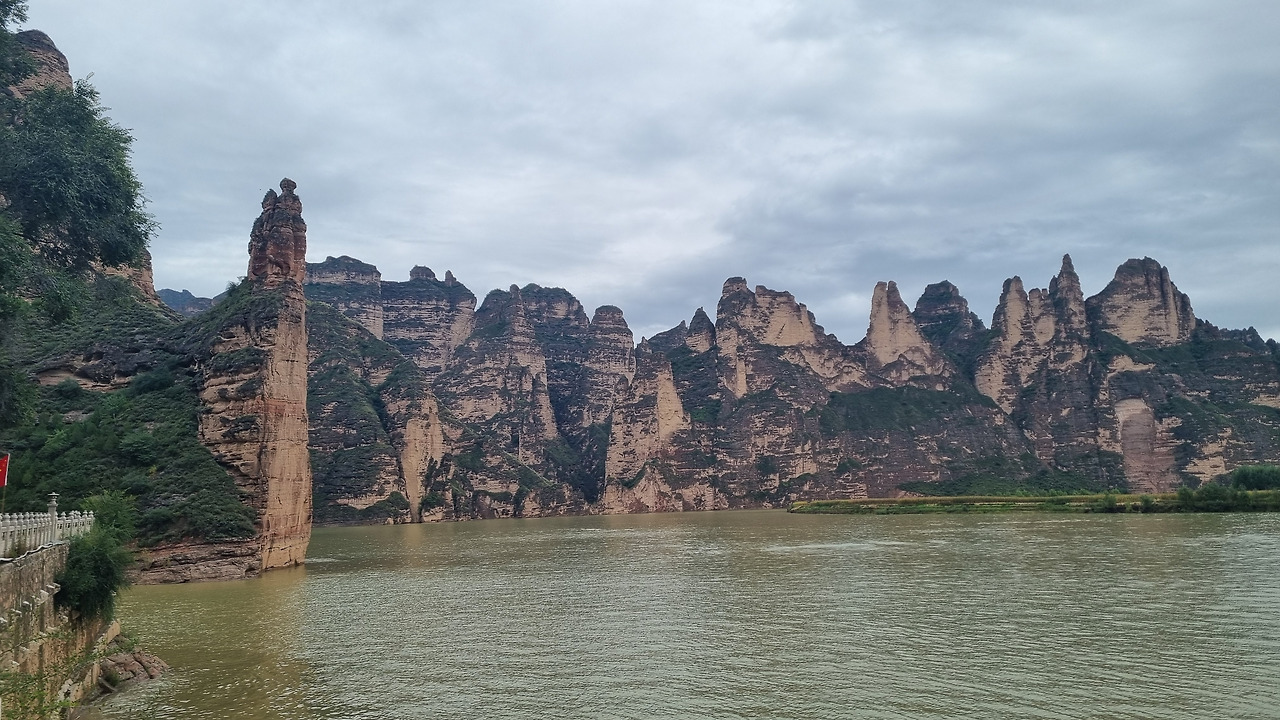 도로가 높은 곳에 위치하다 보니 도로 옆은 깊은 계곡이다. 도로 옆에 있는 전망대에 세워준다. 세상에!! 저 멀리 펼쳐진 긴 산맥이 보이고, 산맥은 만년설로 덮여있다. 이곳의 고도를 확인해 보았다. 해발 2,500미터 정도로 나타난다. 호수의 절경을 못 본 것은 안타깝지만, 눈 덮인 산맥이 그 보상을 해줬다. 가까이도 산들이 계속 겹쳐 있으며, 그 아래는 까마득한 절벽이다. 저 아래 낮은 곳에는 황톳빛의 강물이 흐르고 있다. 바로 황하이다. 최고의 절경이다. 오늘 이 경치를 본 것만으로 여기까지 온 보람이 있다. 가히 “녹색의 그랜드 캐년”이라 할 만하다.