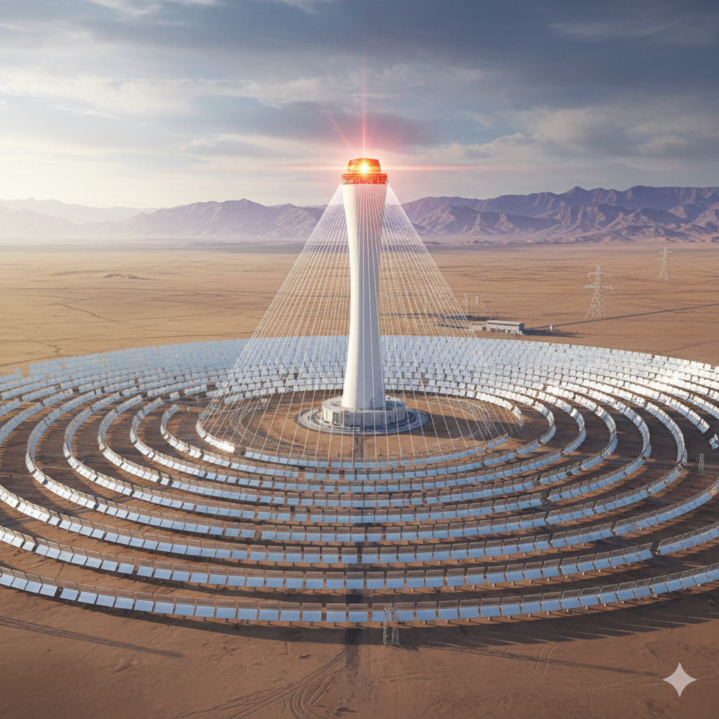 이 발전소는 거대한 집광탑과 1만 2천 개 이상의 거울(헬리오스탯)로 구성된, 마치 SF 영화에 나올 법한 초현대적인 모습을 하고 있다. 발전소의 작동 원리는 간단하면서도 매우 독창적이다. 12,000개 이상의 거울(헬리오스탯) 이 하루 종일 태양을 따라 움직이며, 태양 빛을 중앙에 세워진 260미터의 집광탑 꼭대기로 반사시킨다. 탑 꼭대기에 모인 강렬한 열에너지는 녹은 소금을 섭씨 550도 이상으로 가열한다. 녹은 소금은 높은 열을 저장하고 전달하는 데 탁월한 효과를 갖는다. 가열된 녹은 염은 특수 배관을 통해 보일러실로 이동하여 물을 끓여 고압 증기를 만들고, 이 증기로 터빈을 돌려 전기를 생산한다. 이 발전소에 대해서는 다음의 링크를 참고하기 바란다.