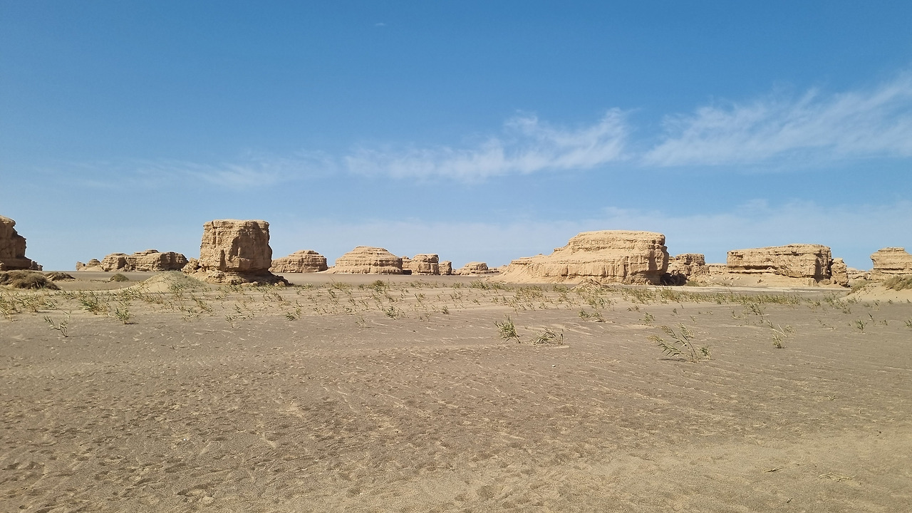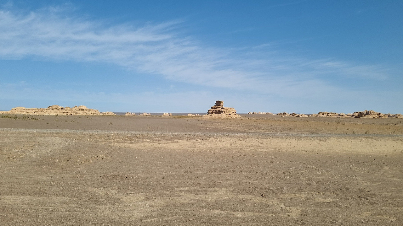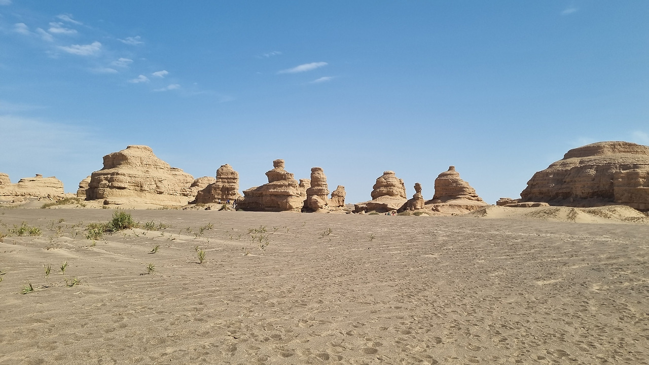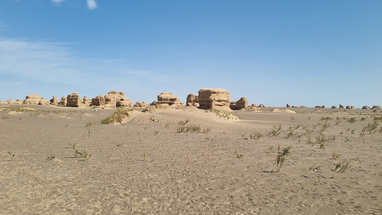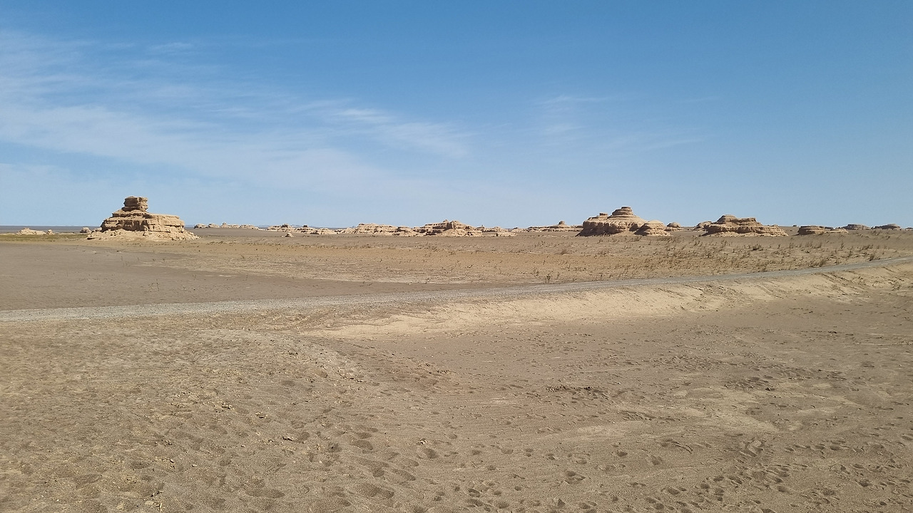 이단지질공원은 완전한 사막지대이다. 아득한 사막 저편으로 모래의 지평선이 보인다. 관광버스는 먼저 금사희탑(金獅戲塔) 구역으로 가서 우리를 내려놓는다. 이름 그대로 황금색의 사자가 희롱하는 모습의 바위가 있다. 두 번째는 사해행주(狮海行舟) 구역으로서 바다를 항해하는 배 모양의 지형이다. 세 번째는 공중누각(空中樓閣) 구역이다. 아단 지형에서도 가장 기이한 형태를 지닌 구역으로서 황토 언덕이 마치 공중에 떠있는 성과 같은 모습으로 보인다. 마지막으로 공원의 최고 하이라이트라 할 수 있는 서해함대(西海艦隊) 구역이다. 수십 개의 아단 지형이 마치 함대 대형처럼 병렬적으로 배열되어 있다.