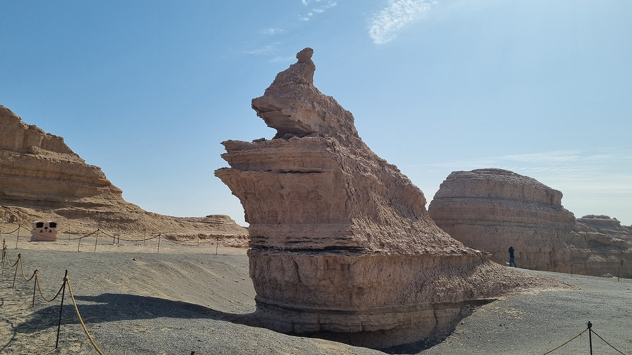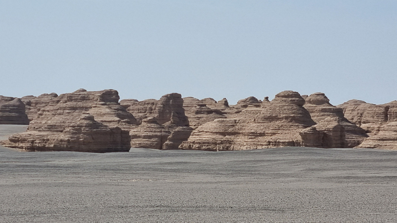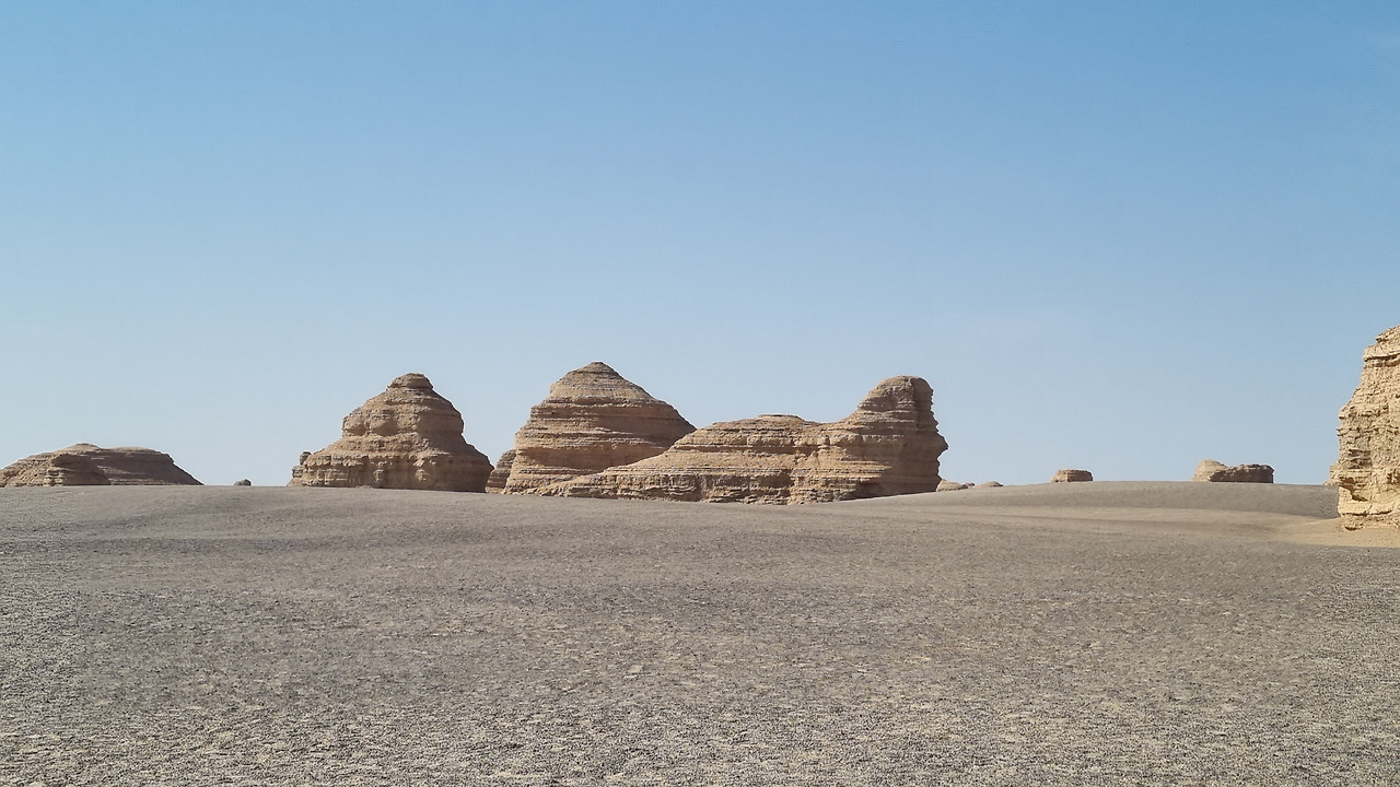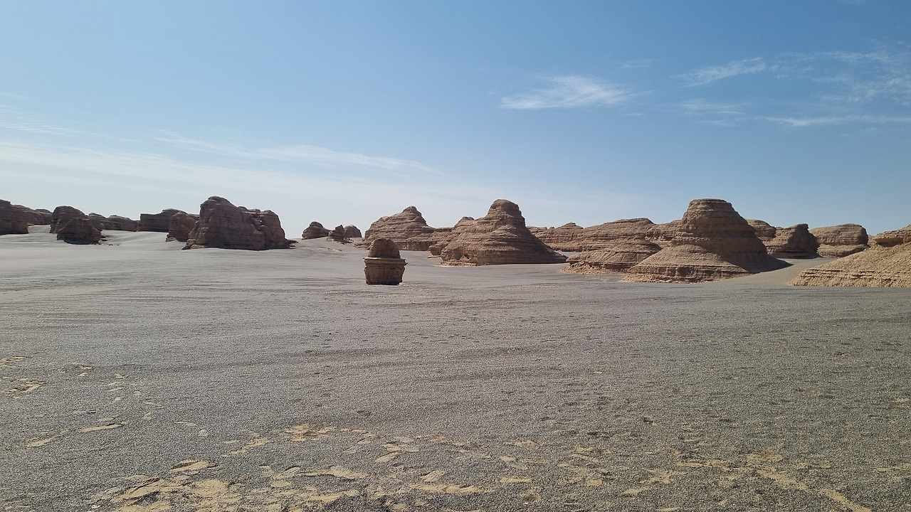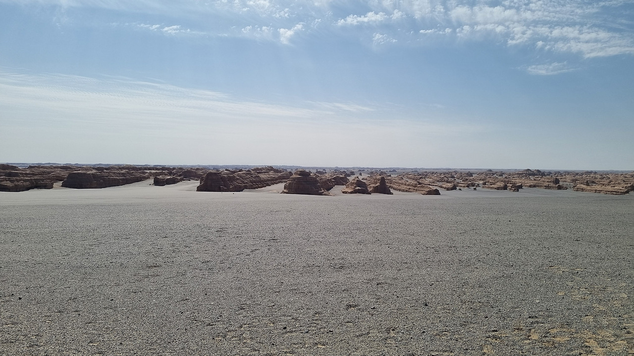 이단지질공원은 완전한 사막지대이다. 아득한 사막 저편으로 모래의 지평선이 보인다. 관광버스는 먼저 금사희탑(金獅戲塔) 구역으로 가서 우리를 내려놓는다. 이름 그대로 황금색의 사자가 희롱하는 모습의 바위가 있다. 두 번째는 사해행주(狮海行舟) 구역으로서 바다를 항해하는 배 모양의 지형이다. 세 번째는 공중누각(空中樓閣) 구역이다. 아단 지형에서도 가장 기이한 형태를 지닌 구역으로서 황토 언덕이 마치 공중에 떠있는 성과 같은 모습으로 보인다. 마지막으로 공원의 최고 하이라이트라 할 수 있는 서해함대(西海艦隊) 구역이다. 수십 개의 아단 지형이 마치 함대 대형처럼 병렬적으로 배열되어 있다.