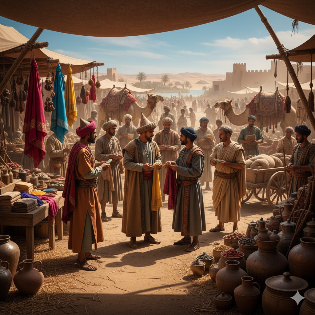 실크로드를 오가는 상단의 규모는 어느 정도였을까? 보통 낙타 300~400마리 정도의 규모가 일반적이었고, 대형상단은 1,000마리도 넘었다고 한다. 작은 상단은 수십 마리 정도의 규모도 있었다고 한다. 이들 상단은 우두머리 격인 상인이 일꾼, 낙타몰이꾼, 잡역꾼 등과 함께 도적에 대비하여 호위대도 거느렸다고 한다. 그래서 큰 상단의 경우 전체 인력이 1,000명을 넘었으며, 보통은 몇백 명 정도였다고 한다.