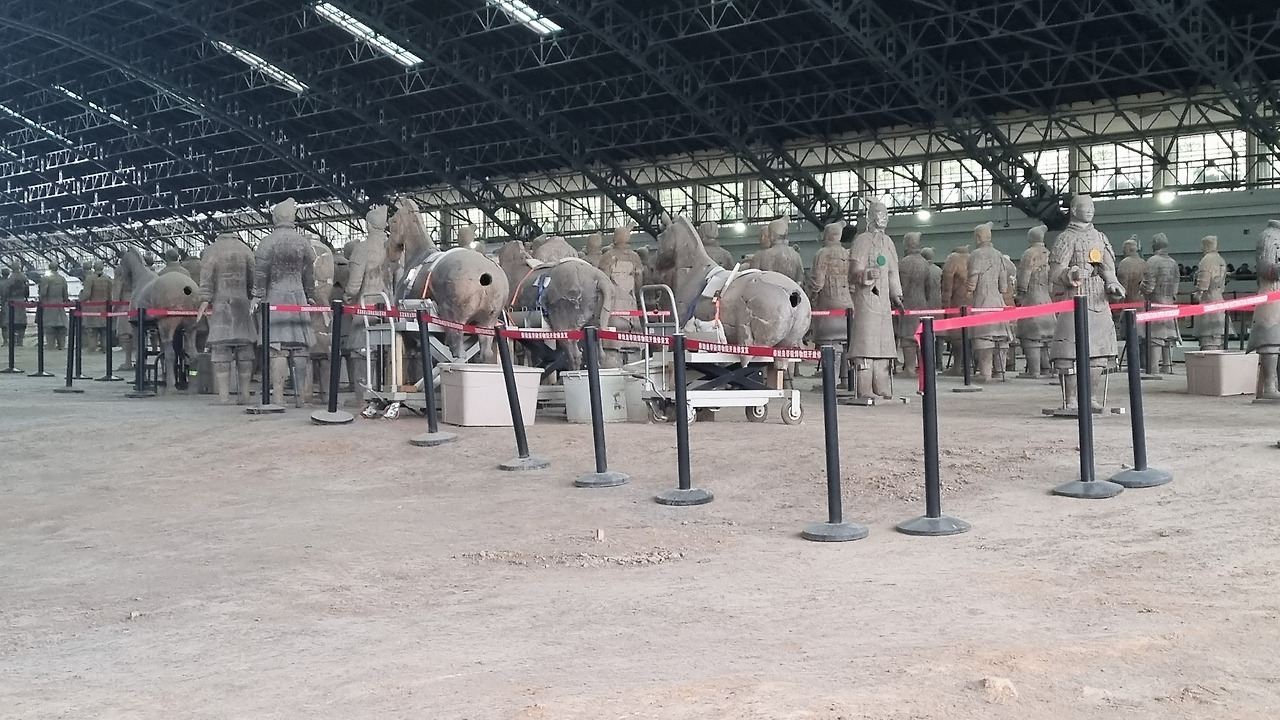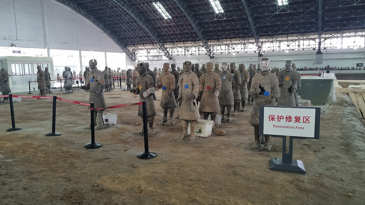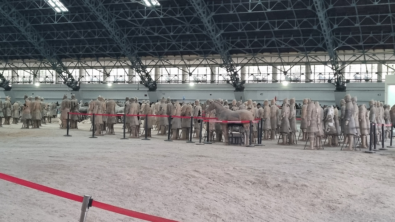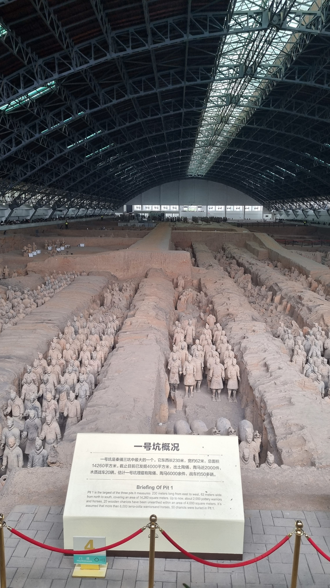 드디어 병마용 1호갱에 들어왔다. 우리가 여러 매체를 통해 봐 왔던 바로 그곳이다. 병마용에는 3개의 갱이 있는데, 1 호갱이 제일 크다. 이곳은 보병과 전차가 혼합된 주력 부대가 편성되어 있는 곳이다. 전체로 총 6000명의 병마용이 있다고 한다. 가장 먼저 발견되었고, 가장 많은 병마용이 복원되어 열병식 같은 웅장한 규모를 느낄 수 있다.