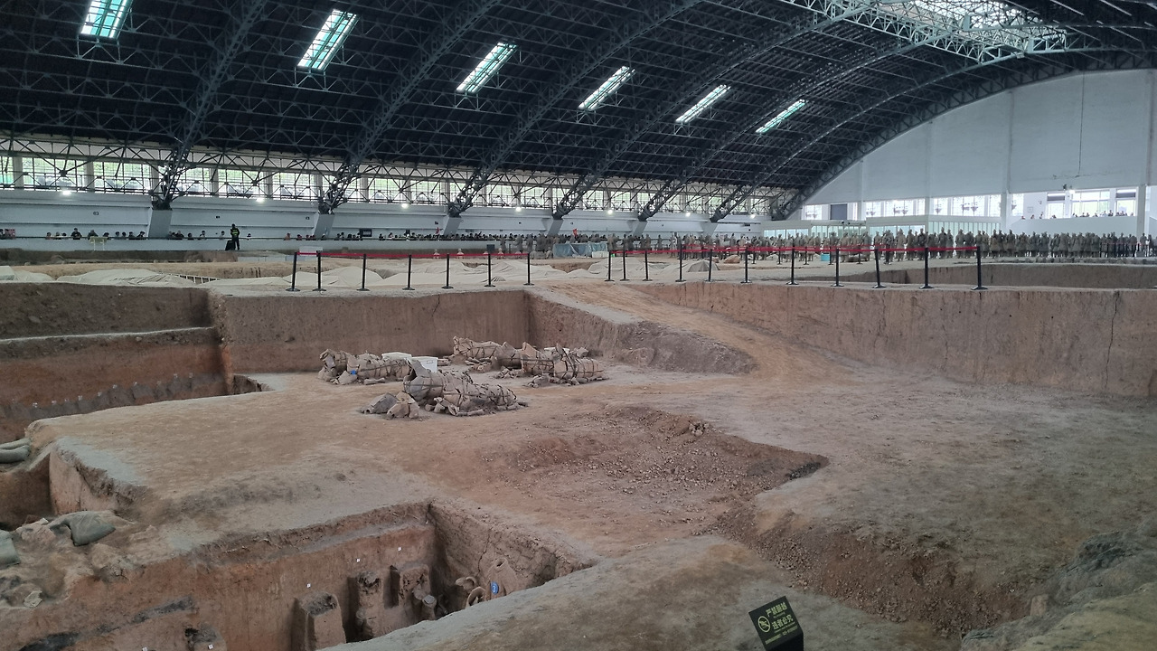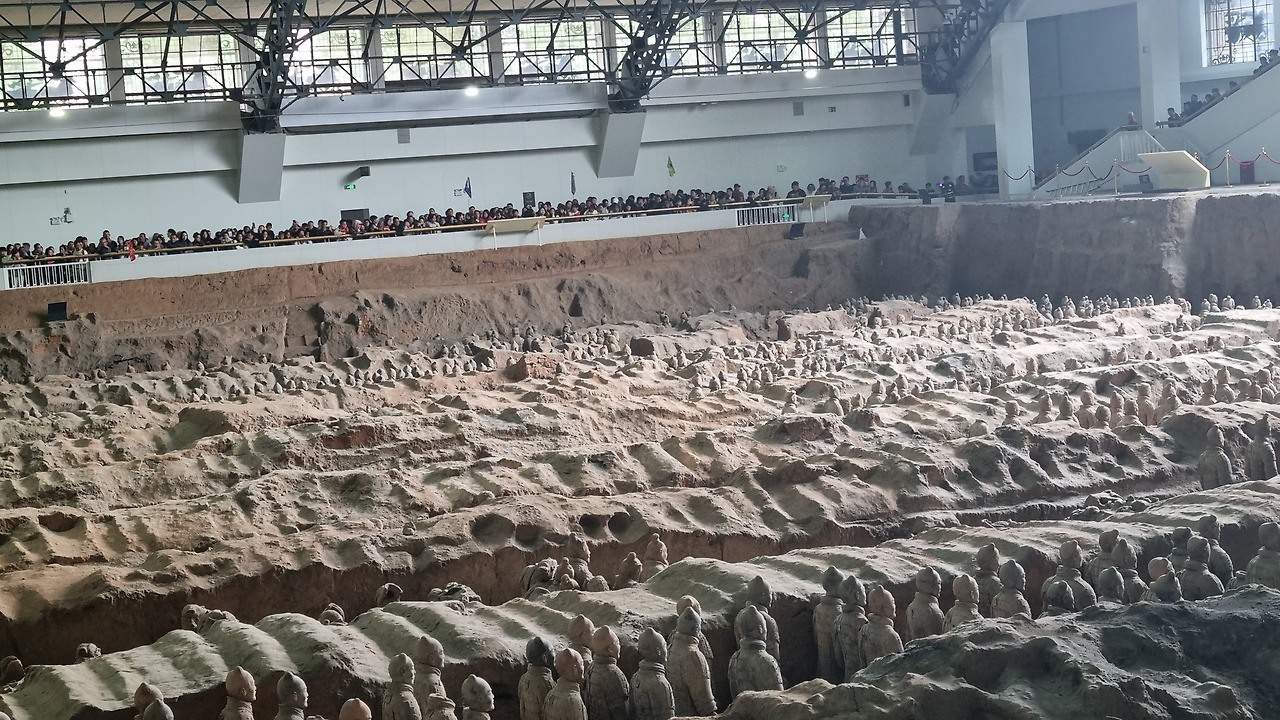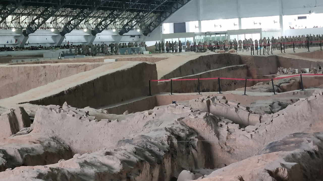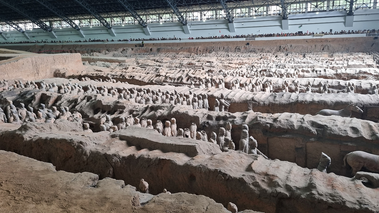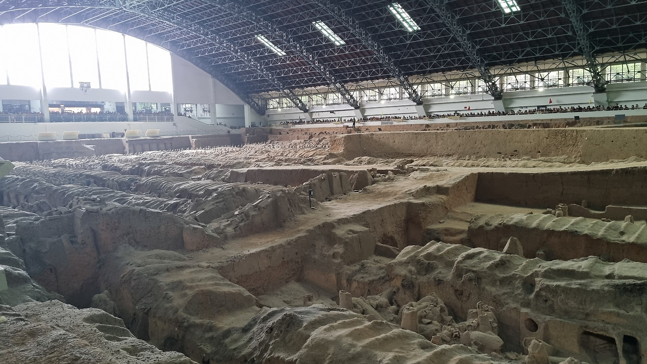드디어 병마용 1호갱에 들어왔다. 우리가 여러 매체를 통해 봐 왔던 바로 그곳이다. 병마용에는 3개의 갱이 있는데, 1 호갱이 제일 크다. 이곳은 보병과 전차가 혼합된 주력 부대가 편성되어 있는 곳이다. 전체로 총 6000명의 병마용이 있다고 한다. 가장 먼저 발견되었고, 가장 많은 병마용이 복원되어 열병식 같은 웅장한 규모를 느낄 수 있다.