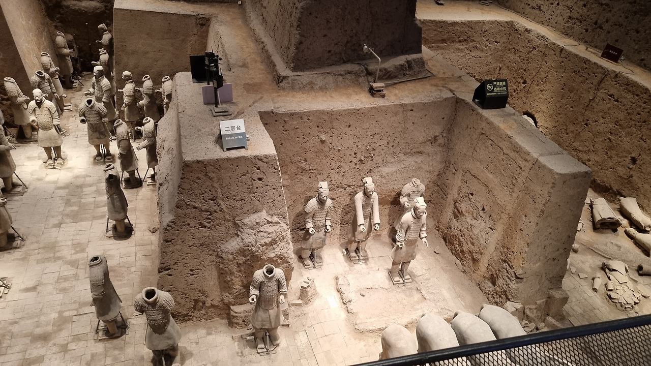 2호갱으로 갔다. 2호갱은 1호갱에 비해 규모가 현저히 작다. 2호갱은 혼성 부대의 갱도로, 보병, 기병, 궁병, 전차병 등 다양한 군종이 정교한 진형을 이루고 있다. 이곳에서 가장 잘 보존된 병마용들이 발견되었다고 한다. 이곳은 현재도 발굴 및 복원 중이이고 하는데 그 표시가 보이기도 한다. 쓰러져 파손되어 있는 병마용이 많이 보인다. 넘어진 상태에서 흙이 덮인 것 같기도 하다. 그런데 넘어진 군사용이 마치 진짜 사람들의 유해처럼 보이기도 한다.