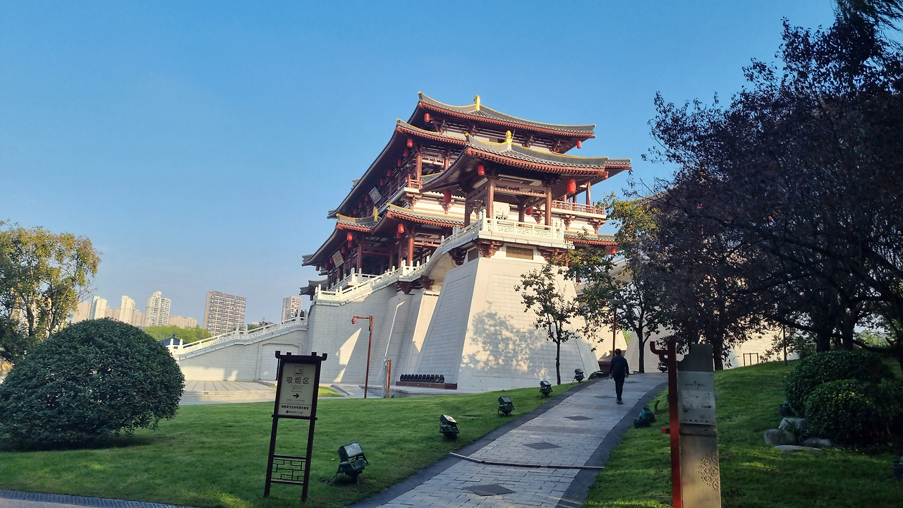 다시 호수 옆 길을 따라 걸으니 무지무지하게 크고 웅장한 중국 전통건물이 나온다. 그 건물은 흰색 화강암으로 된 높은 계단 위에 우뚝 서 있기에 더욱 그 웅장함이 돋보있다. 건물 위에는 두 개의 현판이 걸려 있는데, 위쪽에는 "자운루"(紫雲樓), 아래쪽에는 "대당부용원"이라고 쓰여있다. 건물의 이름의 자운루인 것 같다. 자운루 좌우 옆에는 역시 화강암으로 만든 각각 두 개씩의 정자가 서있다. 자운루나 부속 정자 모두 아름다운 건축물이다.