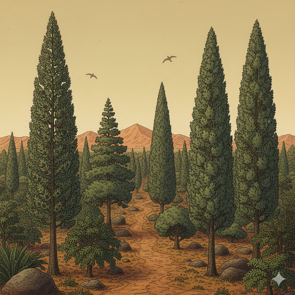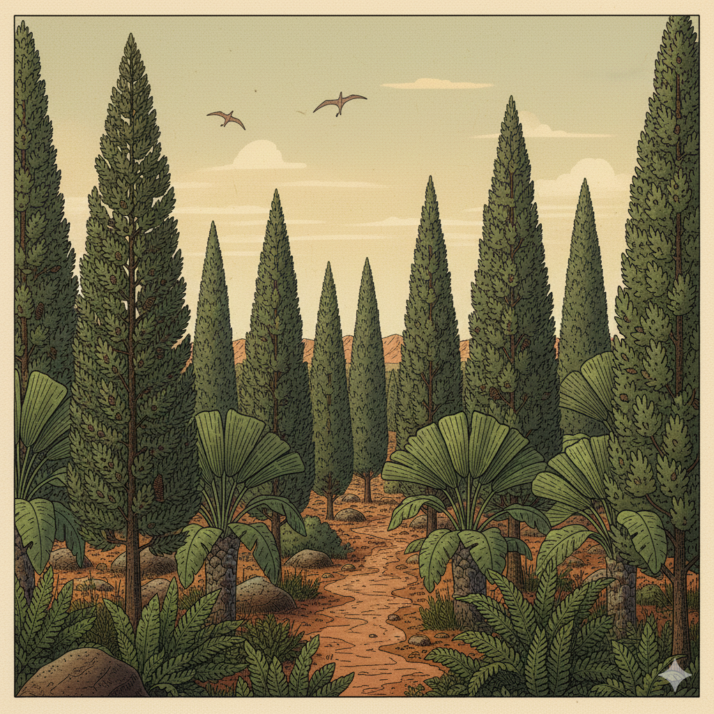 트라이아스기는 고생대의 거대했던 양치식물 시대가 저물고, 겉씨식물(Gymnosperms)이 지구 육상 생태계의 절대적인 주인공으로 등극했던 시기이다. 겉씨식물이란 씨방이 없어 씨앗이 밖으로 드러나 있는 식물 집단을 의미한다.
