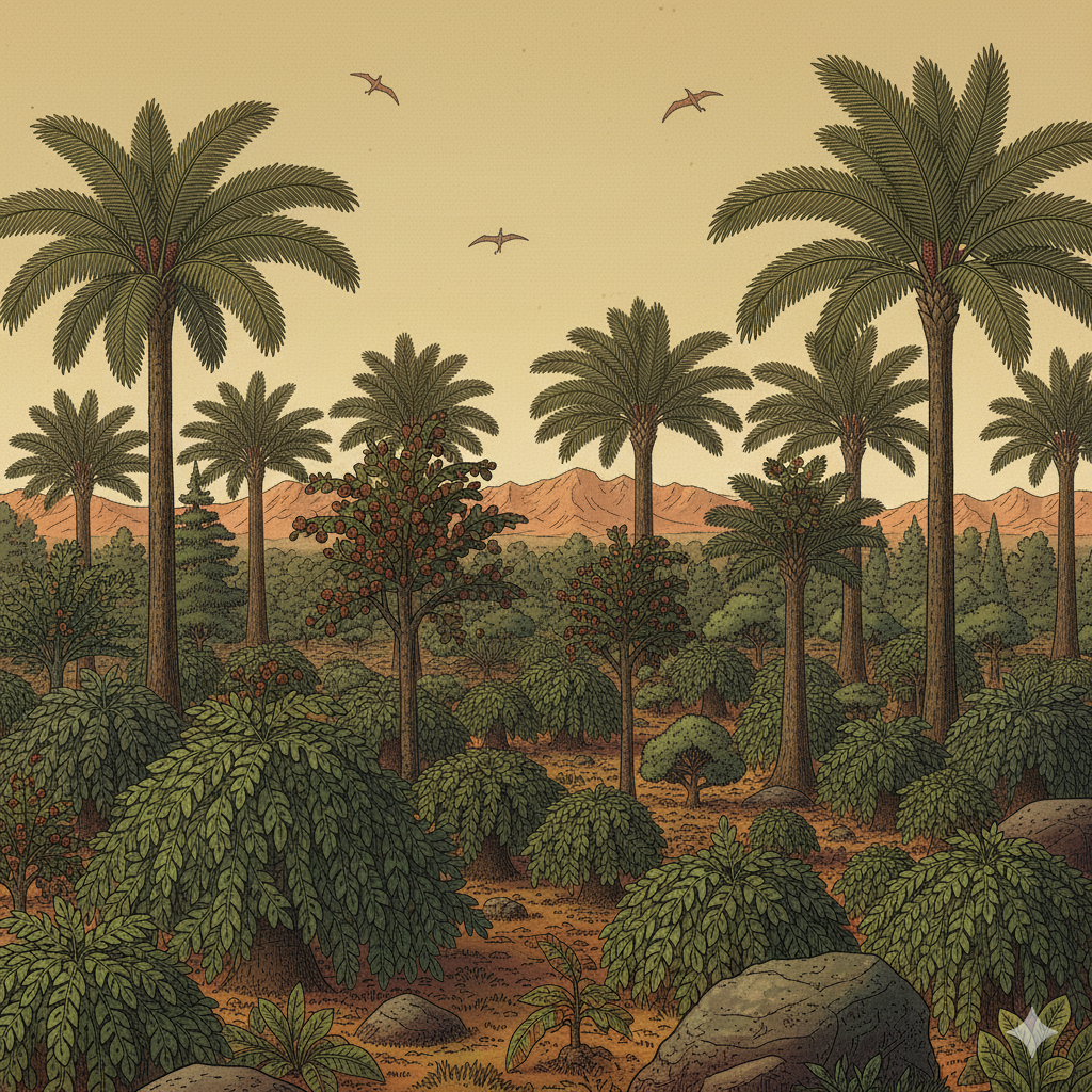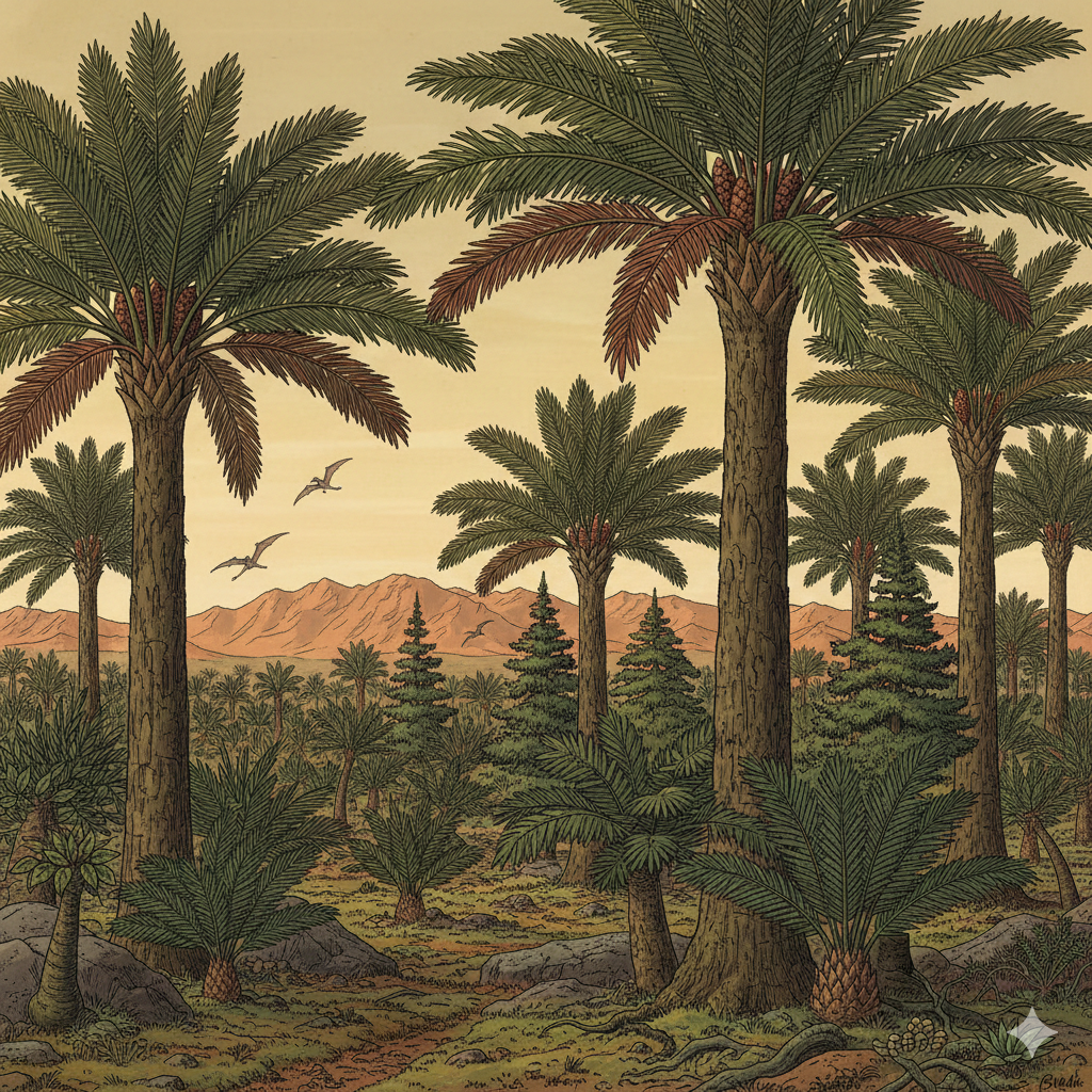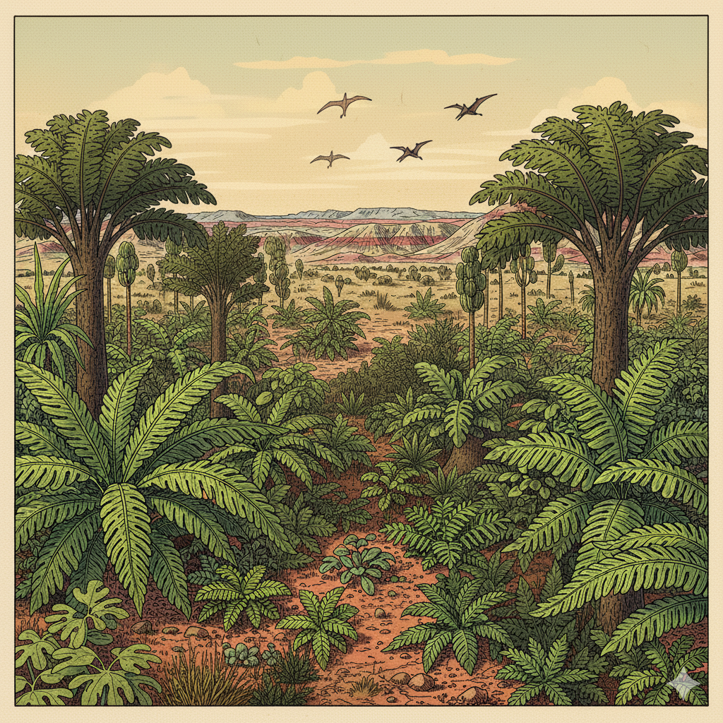 트라이아스기는 고생대를 지배했던 거대 양치식물들이 몰락하고, 살아남은 무리가 변화된 환경에 적응하며 명맥을 유지한 '생존과 변화'의 시기이다.