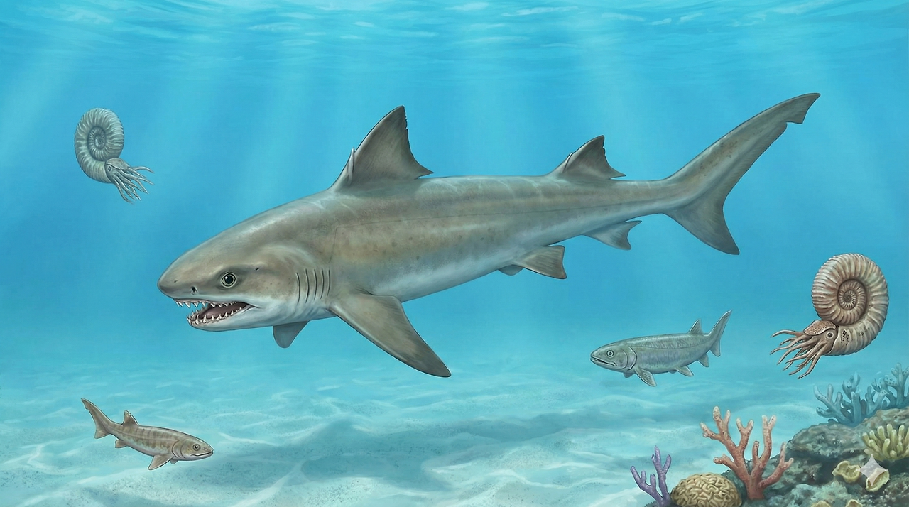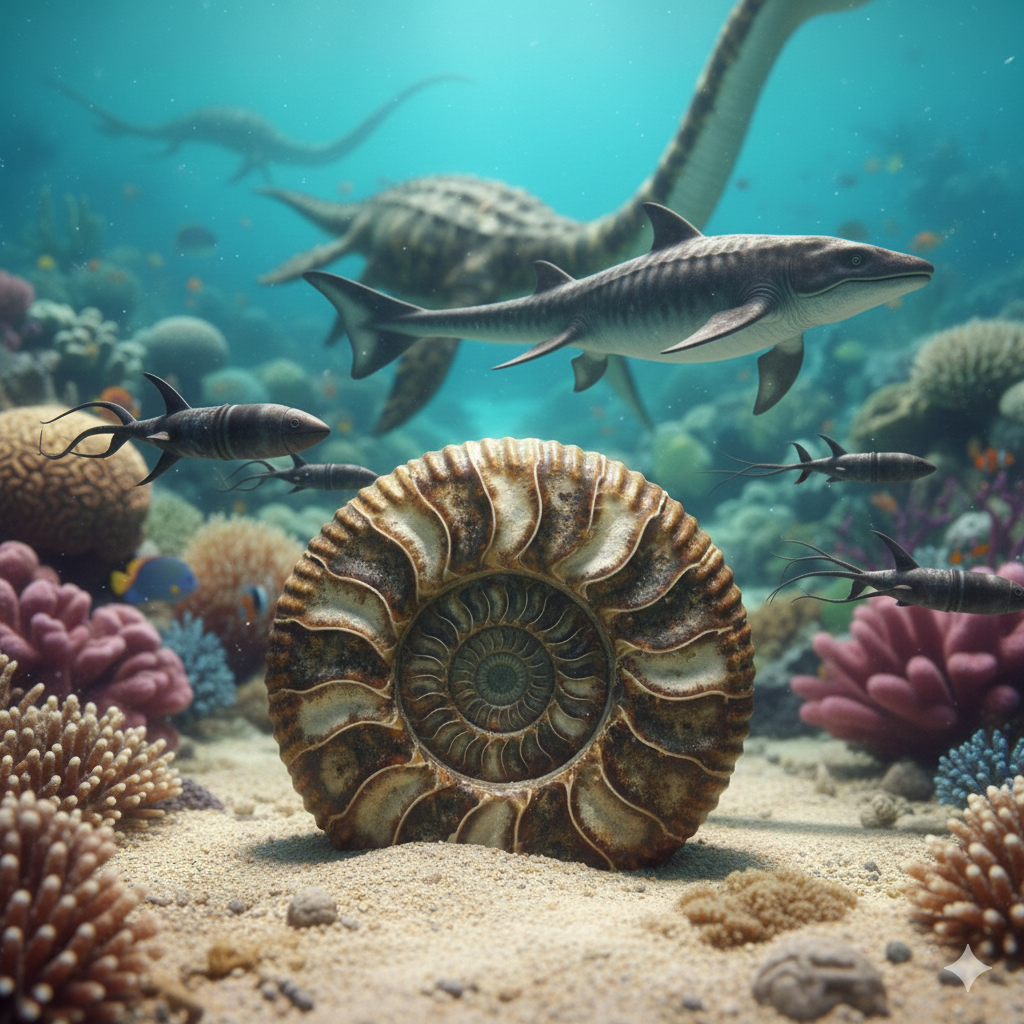 • 앵무조개류(Nautiloids)의 잔존: 암모나이트의 먼 친척인 앵무조개류는 고생대의 영광에 비하면 세력이 위축되었으나 여전히 바다의 한 축을 담당하였다. 암모나이트가 화려하고 복잡한 봉합선을 만들며 급격히 변할 때, 앵무조개류는 단순한 격벽 구조를 유지하며 심해나 특정 안정적인 환경에서 살아남았다.