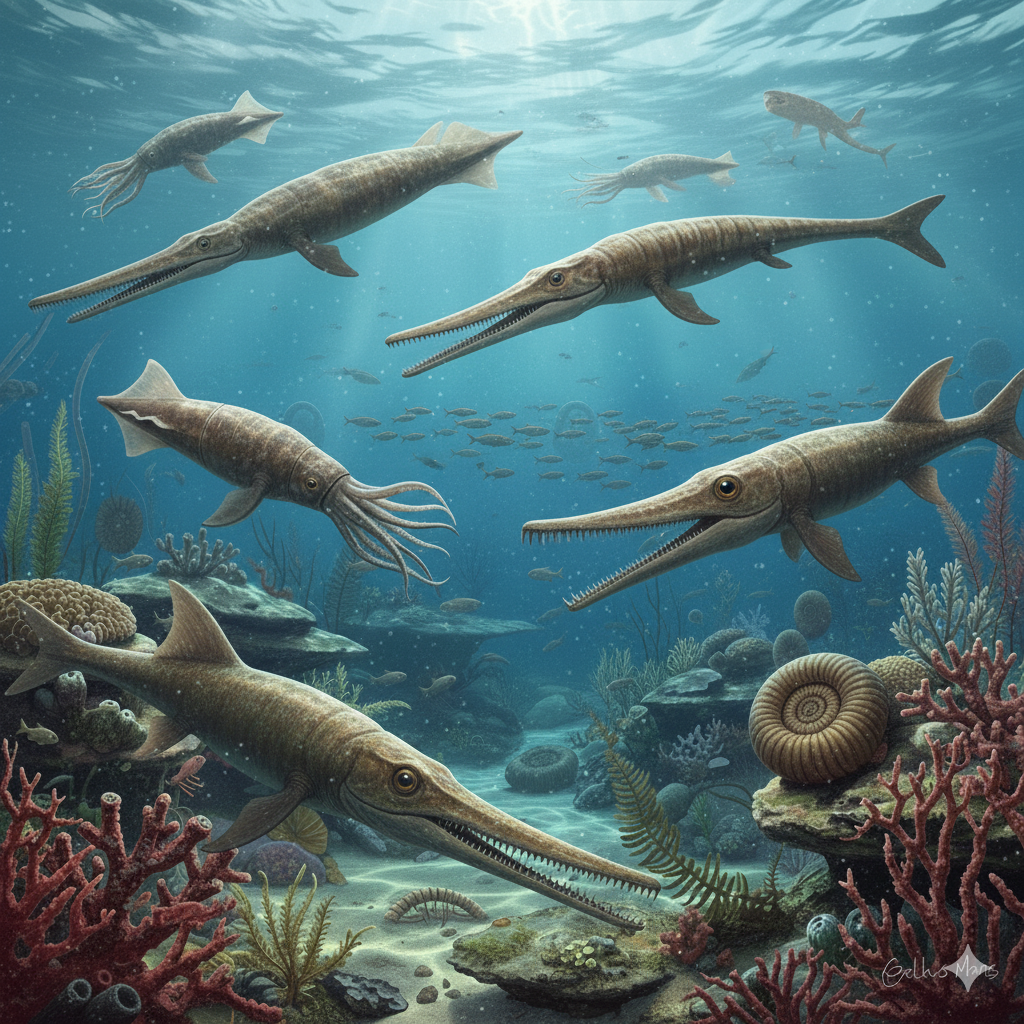 트라이아스기의 바다는 페름기 대멸종 이후 텅 빈 공간을 채우기 위해 무척추동물과 어류가 폭발적으로 진화한 시기이다. 해양 파충류가 정점에 있었다면, 그 아래의 생태계는 다음과 같은 다양한 동물들이 지탱하고 있었다.
