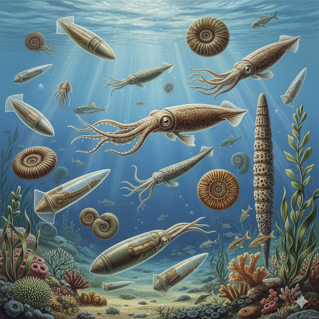 • 벨렘나이트(Belemnites)와 초기 초형류: 오늘날의 오징어와 문어의 조상격인 두족류들도 이 시기에 본격적으로 기틀을 잡았다. 벨렘나이트는 몸 내부에 원뿔 모양의 단단한 초(Guard)를 가지고 있었는데, 이것이 화살촉처럼 생겨 화석화된 것을 화살석이라 부른다. 껍데기를 몸 밖이 아닌 안으로 숨기거나 축소함으로써 저항을 줄였고, 이를 통해 포식자인 해양 파충류로부터 도망치거나 먹이를 쫓기에 유리한 빠른 기동력을 확보하였다.