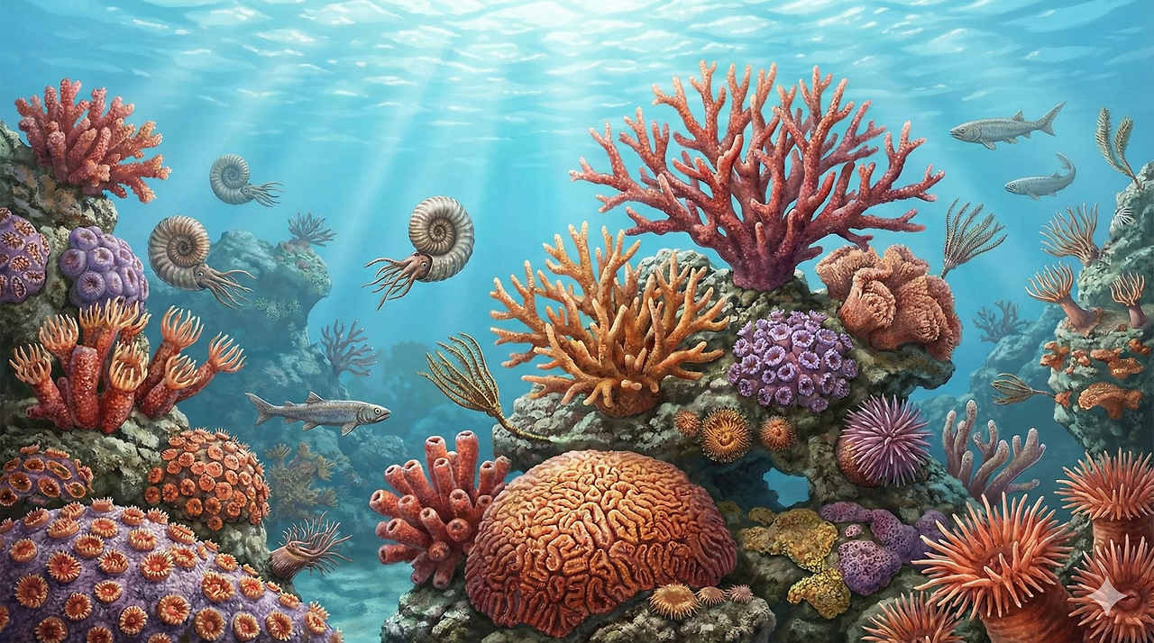 고생대를 지배했던 사방산호와 바닥산호가 멸종한 자리에 오늘날 우리에게 익숙한 육방산호(Scleractinia)가 처음 등장하였다. 이들은 탄산칼슘 골격을 매우 정교하게 쌓아 올렸으며, 수많은 해양 생물에게 보금자리를 제공하는 산호초 생태계를 재건하였다. 트라이아스기 중기 이후부터는 전 세계적으로 거대한 산호초 지형이 형성되기 시작하였다.