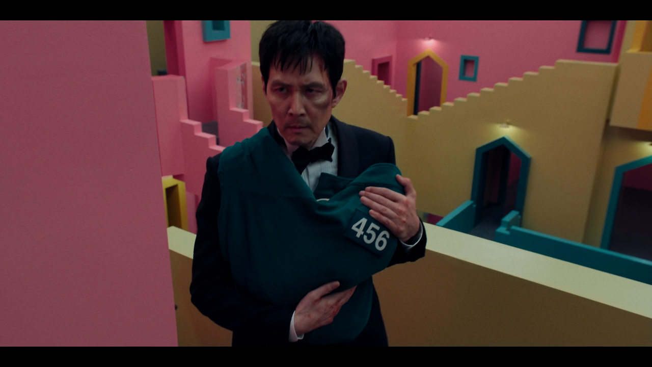 기훈은 아기를 안고 입을 한 번 맞춘 후 아기를 내려놓고는 스스로 기둥에서 뛰어내린다. 해경이 섬에 들이닥쳤다. 프론트맨은 부하들에게 섬의 자폭 장치를 가동시킨 후 퇴각하라는 명령을 내린다. 그는 섬을 떠나기 전 마지막으로 죽은 기훈의 시체를 바라보고는 아기를 데려간다. 얼마 후 오징어 게임장은 대폭발을 일으킨다.
