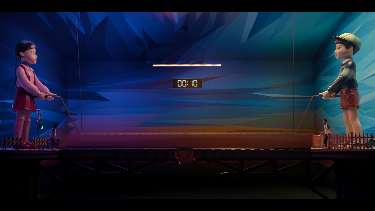 기훈은 자기가 탈락자가 돼 줄 테니 아기만 살려달라고 설득하지만, 명기는 그럴 마음이 조금도 없다. 명기의 속셈은 기훈이 다리를 건너지 못하게 하여 탈락시킨 후, 마지막 기둥에서 자신의 아기를 던져버리면 자기가 우승자가 된다는 것이다. 그렇다고 해서 기훈과 아기 모두를 이 단계에서 탈락시켜 버리면, 마지막 기둥에서는 자신 혼자만 남기 때문에 희생시킬 사람이 없으므로 자신도 탈락할 수밖에 없다.