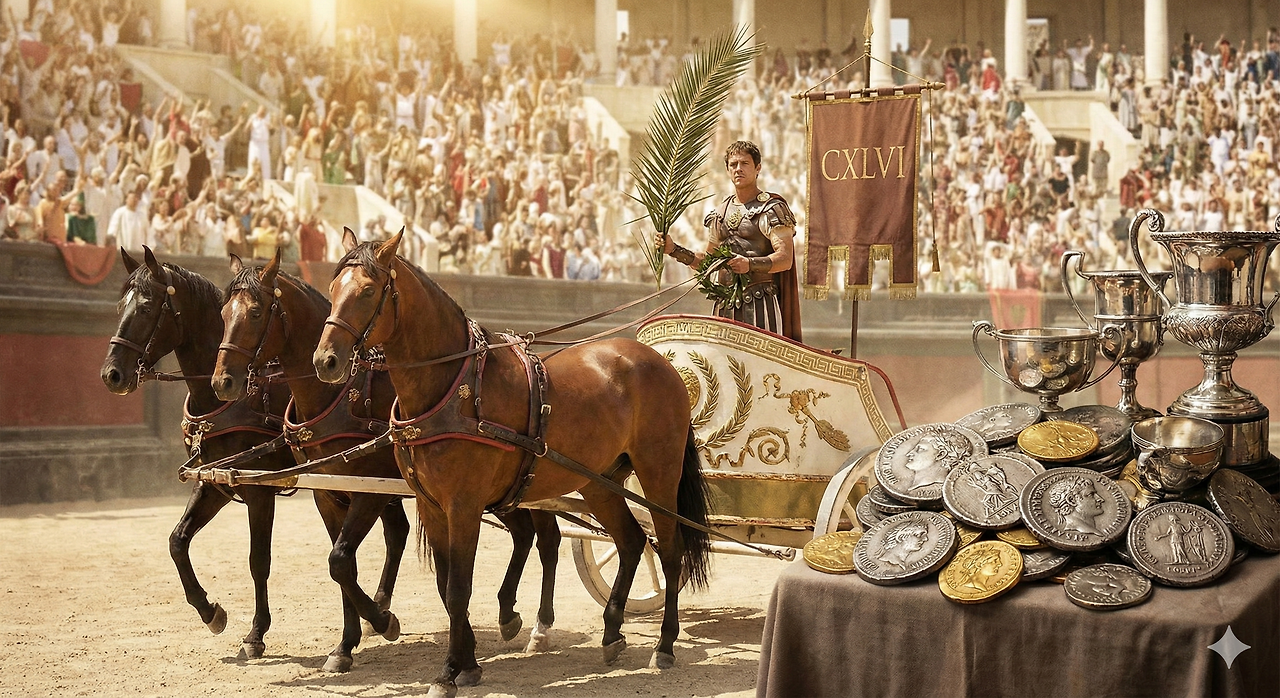 디오클레스는 24년간에 걸쳐 4,257회의 루디 경주에 출전하여 3분의 1이 넘는 1,462회 우승을 차지했다. 변방에서 몇 번 우승한 벤허와는 차원이 다르다. 그는 선수 생활 중 총 약 3,600만 세스테르티우스를 벌어들였다고 한다. 이는 현대 화폐 가치로 환산한다면 약 150억 달러(한화 약 20조 원)에 해당한다고 한다. 이 돈은 당시 로마군 1개 군단을 2년 반 동안 유지할 수 있는 수준이었다.