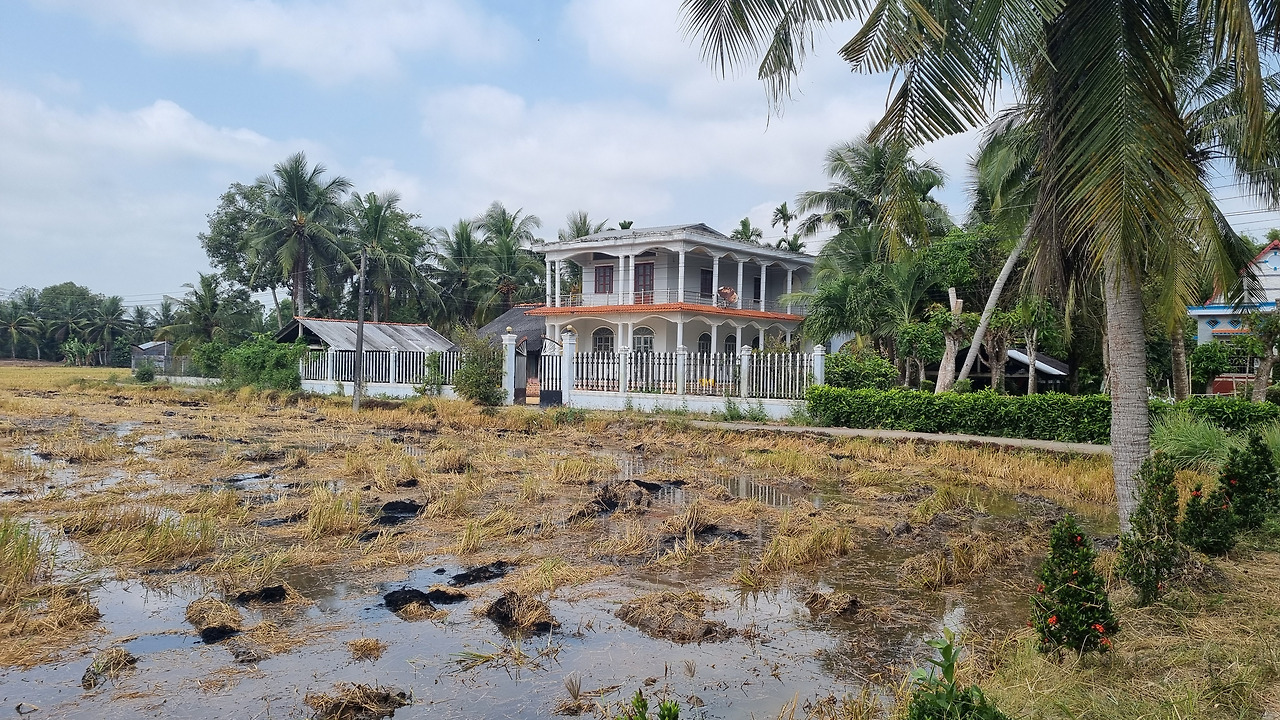 구글 맵은 더 좁은 길로 안내한다. 지금까지는 계속 코코넛과 바나나 농장만 지나왔는데 이제는 논들도 보인다. 작년에 쩌우독(Châu Đốc)에서는 지평선이 보이는 광막한 넓이의 논들을 보았는데, 여기는 논과 농장이 섞여 있어 그렇게 넓은 평야는 볼 수 없다. 곳곳에 농로와 같은 좁은 길이 있고 수로가 지나간다.