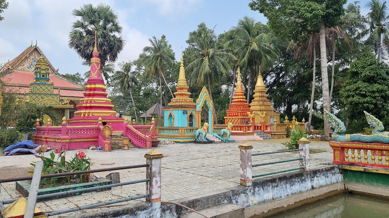 가다 보니 큰 사원이 보인다. 안으로 들어가니 먼저 연못 위에 있는 좌불상이 시선을 끈다. 연못과 어우러지는 아주 멋진 불상이다. 내부에서 공사가 진행 중이라 절을 새로 짓고 있다는 생각이 들었다. 크메르 형식의 사찰인데 생각만큼 화려하지는 않다. 기본적으로는 크메르 양식에 베트남적인 특징이 가미된 느낌이다. 아무런 설명이 없어 어떤 사원인지 몰랐는데, 이 글을 쓰면서 제미나이에게 물어보니 18세기 후반에 세워진 솜 롱 사원(Chùa Som Rong)이라고 한다.