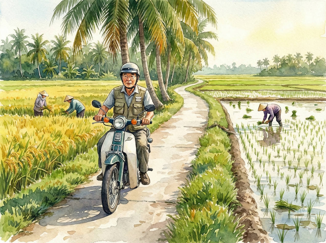 우리나라 논은 색깔이 모두 같지만 여기는 논마다 다르다. 한쪽 논에서는 누렇게 익은 벼를 수확하고, 그 옆에서는 모내기를 한다. 수확이 끝나 누런 밑동만 남은 논이 있는가 하면, 모내기를 기다리는 듯 물만 출렁이는 빈 논도 있다.