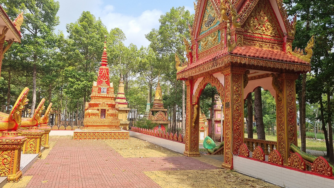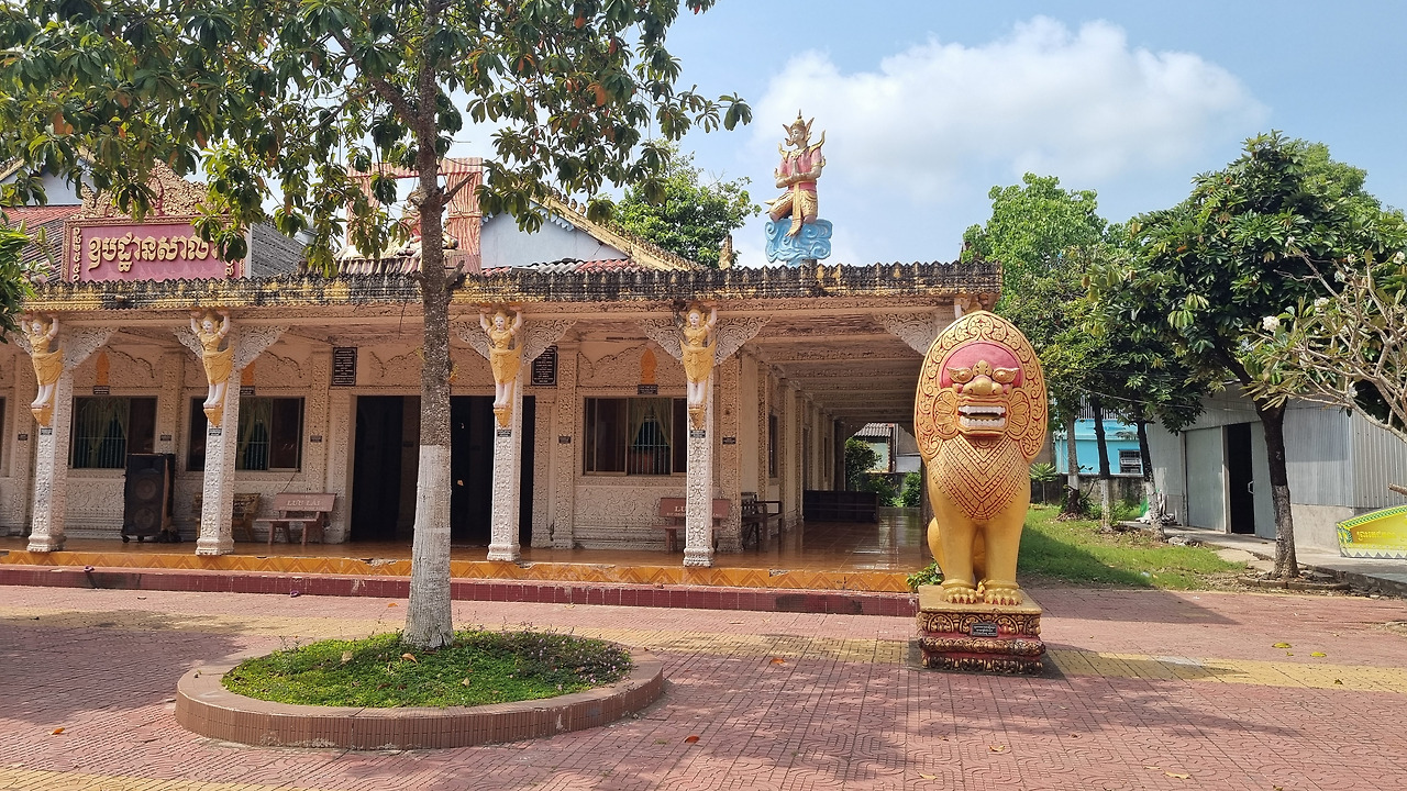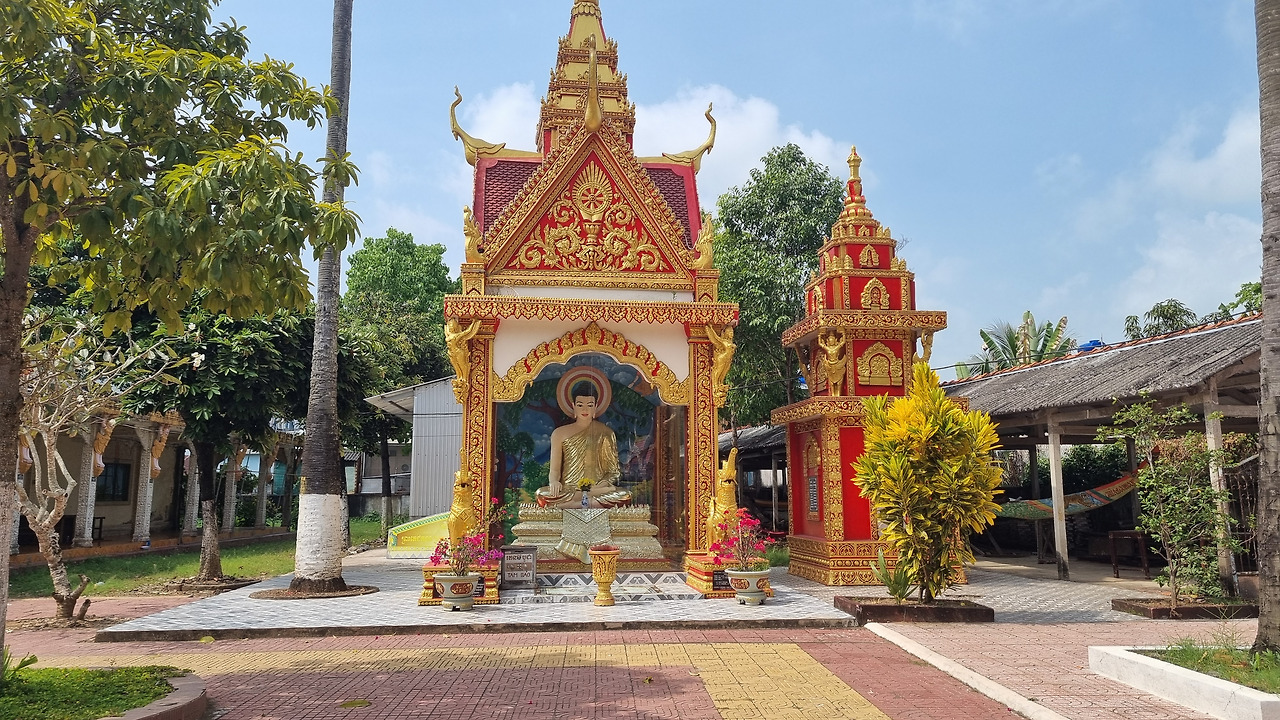 가다보니 화려한 사원이 나타난다. 확인해보니 ‘스레이 타 몬 사원(Wat Srey Ta Mon, Chùa Srey Ta Mon)’이다. 이 사원은 지붕 위의 가루다 장식, 화려한 기둥 장식, 그리고 입구를 지키는 대형 사자상(Singha) 등 전형적인 크메르(Khmer) 불교 양식을 띠고 있다. 이 사원은 1615년에 처음 건립되었다고 하는데, 당시 이 지역의 자산가였던 콩 몬(Kong Mơn, 일명 타 몬) 할아버지와 티 떠이(Thị Tây) 할머니 부부가 사원 부지로 약 3헥타르(약 9,000평)의 땅을 기부하면서 역사가 시작되었다고 한다. 이 사원에서 가장 유명한 상징물은 멀리서도 한눈에 들어오는 대형 황금 입불상이다. 이는 메콩델타 지역의 다른 크메르 사원들과 비교해도 그 규모와 화려함이 뛰어나다고 한다. 사원 내부에는 부처의 생애를 묘사한 벽화들이 그려져 있다.