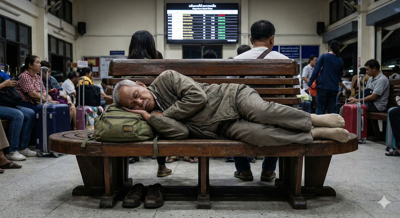 한 시간쯤 지나서 방콕행 열차가 왔다. 대기실에 있던 사람들이 거의 빠져나가 빈 벤치가 여기저기 보인다. 몸이 너무 괴로우니 할 수 없다. 염치 불고하고 벤치에 누웠다. 허리가 펴지니 조금 살 만하다. 보조 배낭을 베고, 신발까지 벗고 벤치에 누워 눈을 감았다. 완전히 노숙자 꼴이다. 심심찮게 모기도 문다. 선잠이 들었다 깨기를 몇 번 반복하니 열차 시간이 되었다.