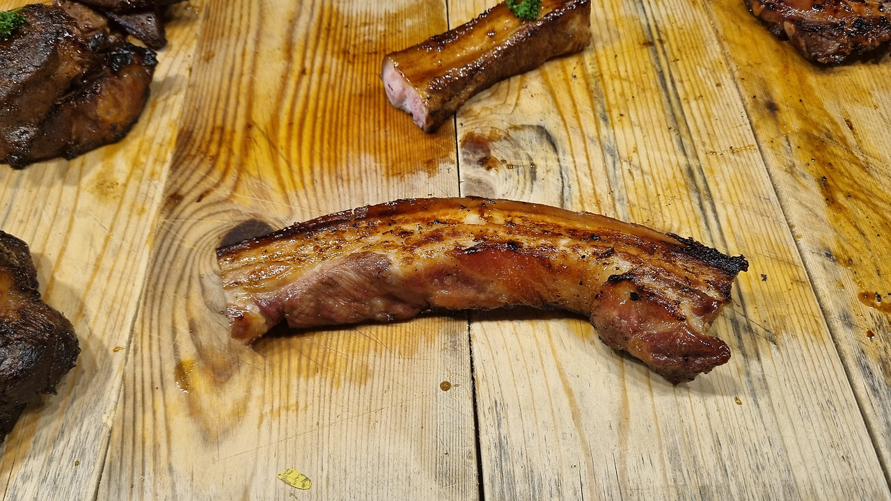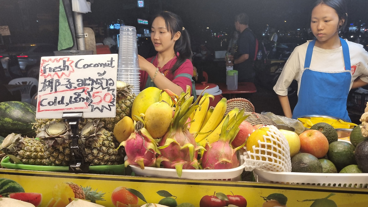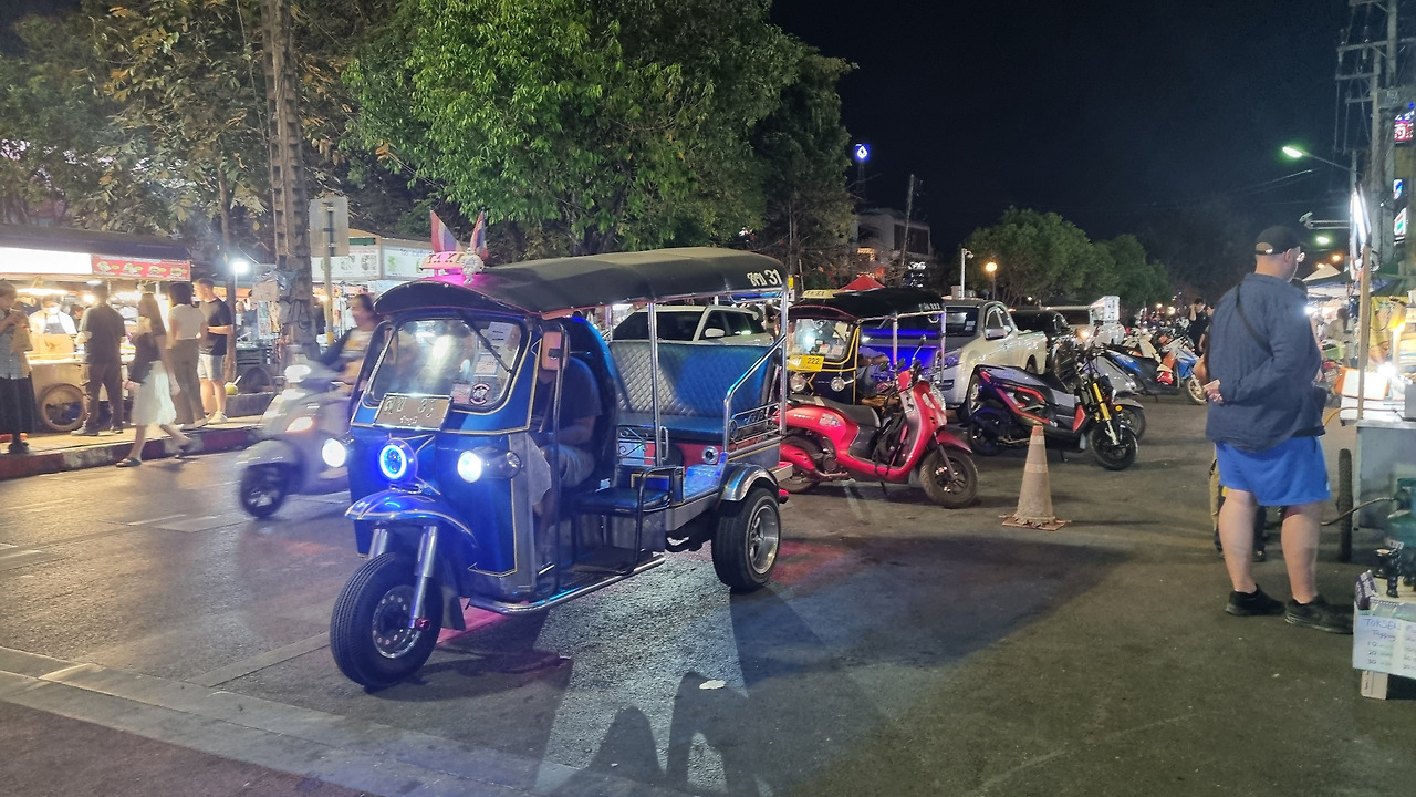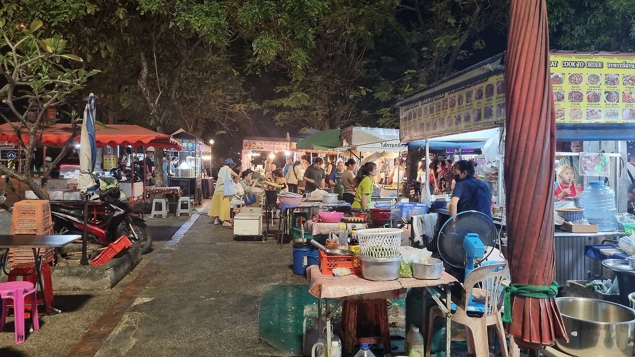 저녁이 되어 어제 갔던 창푸악 게이트 야시장에 다시 갔다. 먼저 망고 스무디를 마시며 음식 매대를 둘러보았다. 먹음직스러운 삼겹살 구이가 보여 200그램을 200바트, 우리 돈 9천 원 정도에 샀다. 맛이 꽤 훌륭했다. 국수를 한 그릇 더 먹을까 생각도 했으나 그만두었다. 적당히 먹는 것이 몸에 부담이 없다.