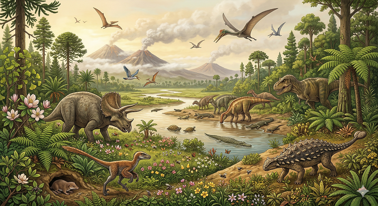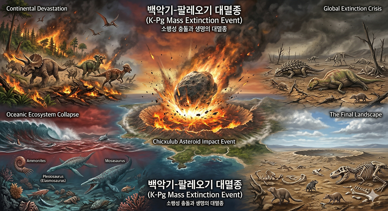 백악기 말인 약 6,600만 년 전, 지구 생명체 종의 약 75%가 사라지는 대멸종 사건이 발생하였다. 이는 오늘날 멕시코 유카탄 반도에 떨어진 거대 운석(치클루브 충돌구)이 주된 원인으로 지목된다. 이 충돌로 발생한 먼지와 황산염 입자가 햇빛을 차단하여 지구적 냉각과 광합성 중단을 초래하였다. 이로 인해 조류를 제외한 모든 공룡, 익룡, 해양 파충류, 암모나이트 등이 완전히 멸종하였다. 이는 이후 신생대에 포유류가 번성하게 되는 결정적인 계기가 되었다.
