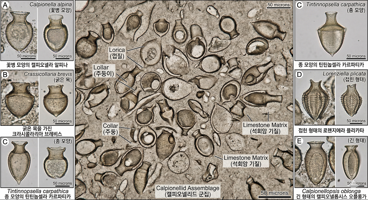 ※ 칼피오넬리드는 중생대 쥐라기 말기부터 백악기 초기까지 해양에 번성한 미화석의 일종이다. 석회질의 단단한 껍질(로리카)을 가진 단세포 부유성 원생동물로, 이들은 진화 속도가 빠르고 분포 범위가 넓어 지층의 시대를 결정하는 중요한 표준 화석으로 활용된다. 특히 해양 퇴적층에서 쥐라기와 백악기의 경계를 구분하는 데 결정적인 지표가 된다.