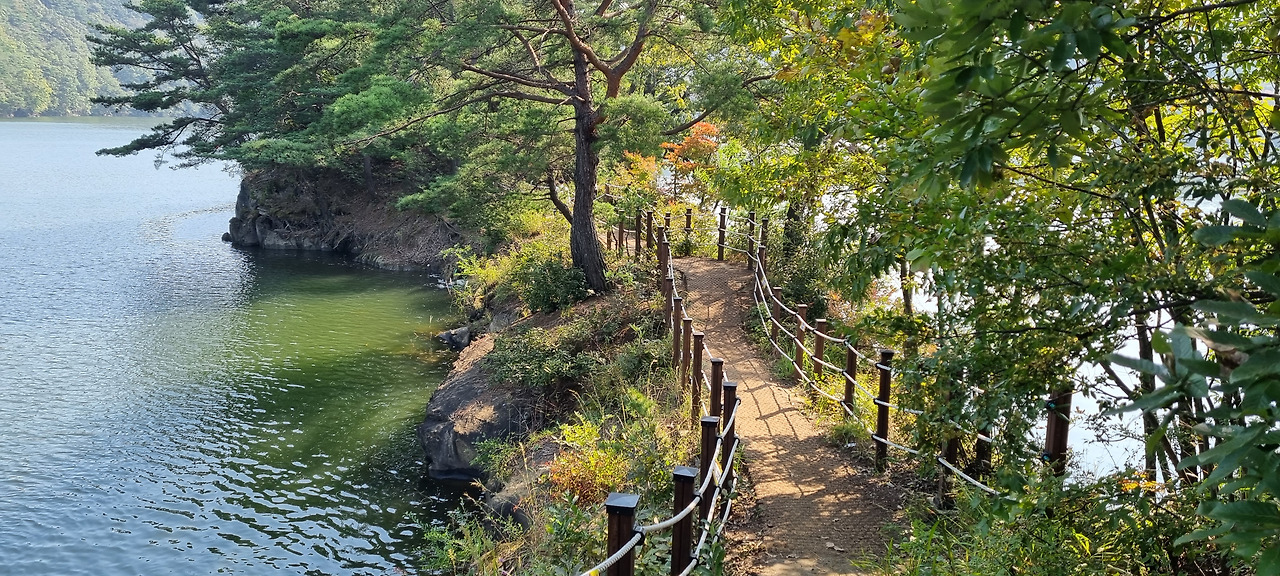 건설현장을 지나 조금 더 가니 나무 데크로 만든 산책로가 나온다. 산책로는 길 양쪽에 호수를 끼고 있는 숲 속을 통과하고 있다. 단풍은 거의 보이지 않는다. 단풍이 드는 나무가 적어서인지, 이곳은 아직 단풍철이 되지 않아서인지 어느 쪽인지 모르겠다. 단풍을 잔뜩 기대하고 왔는데 조금 실망이긴 하다만, 물 위에 떠 있는 이 아름다운 경치를 보는 것으로 그런 아쉬움은 날아가 버린다. 산책로를 걷다 보니 잔디가 심어진 조금 넓은 공터가 나오고, 공터 안에는 장승이 몇 개 서있다. 장승 공원이라고 한다. 장승 공원에 오니 우리와는 다른 방향에서 이곳을 찾는 사람들이 몇몇 있었다. 알고 보니 옛 주차장에 주차를 하고 온 사람들이다. 그쪽은 주차장이 좁아 주차가 쉽지 않다고 한다.